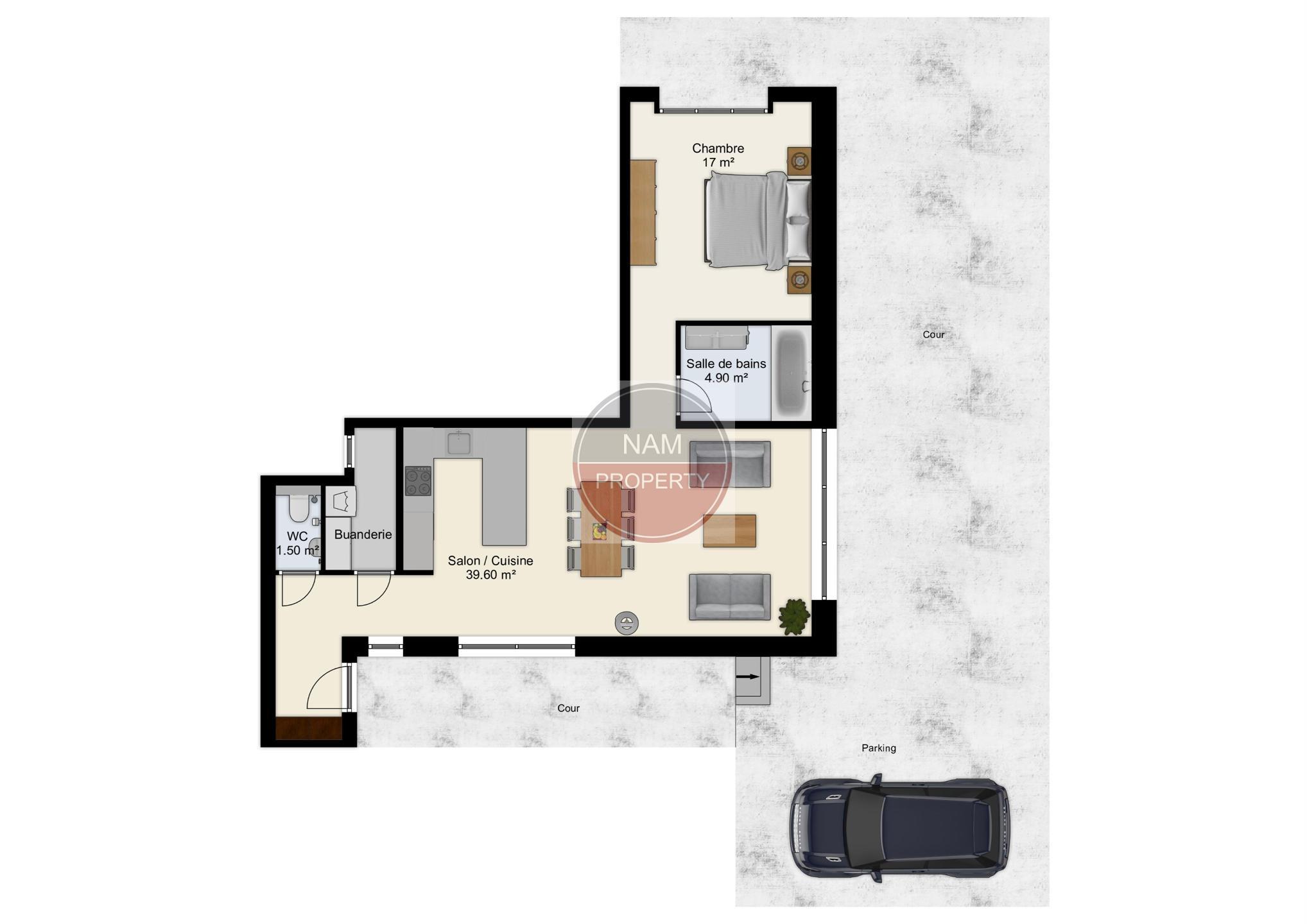 Se compose d'un séjour lumineux, une cuisine équipée US, une buanderie, 1 chambre, une salle de bain.