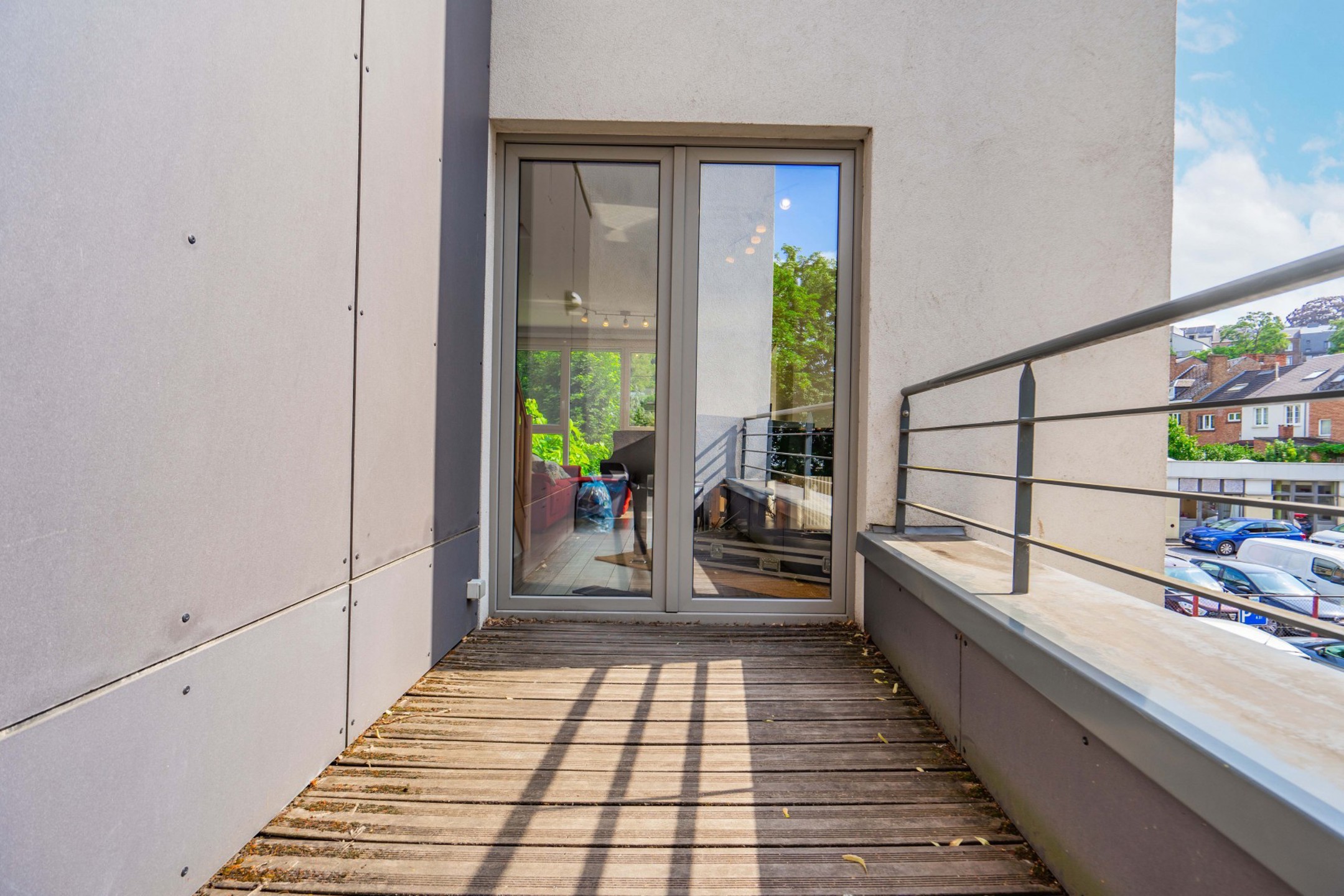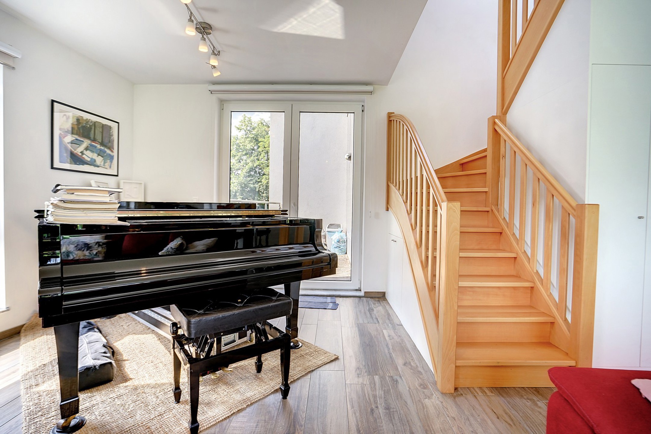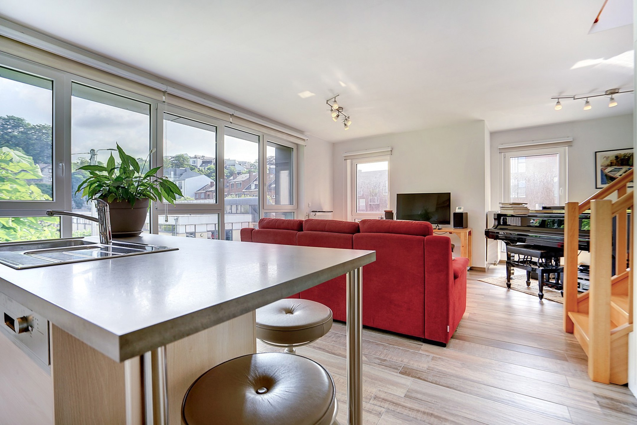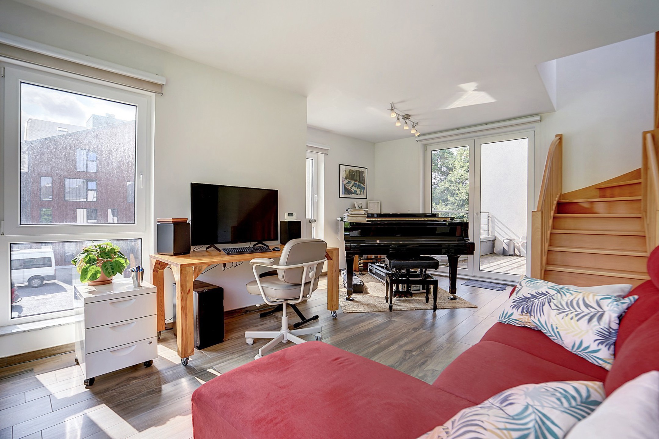 Dans un petit immeuble, très beau duplex de standing de +-106m² composé au 1er niveau de: hall d'entrée, toilette invités, lumineux séjour donnant sur une belle terrasse de +-7m², cuisine US hyper-équipée et buanderie. Nombreux placards de rangement dans le hall d'entrée.