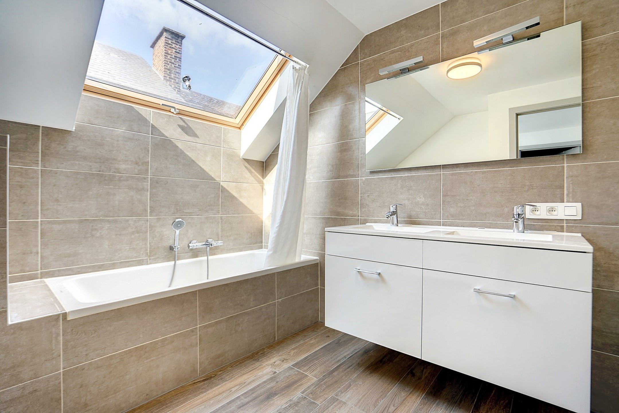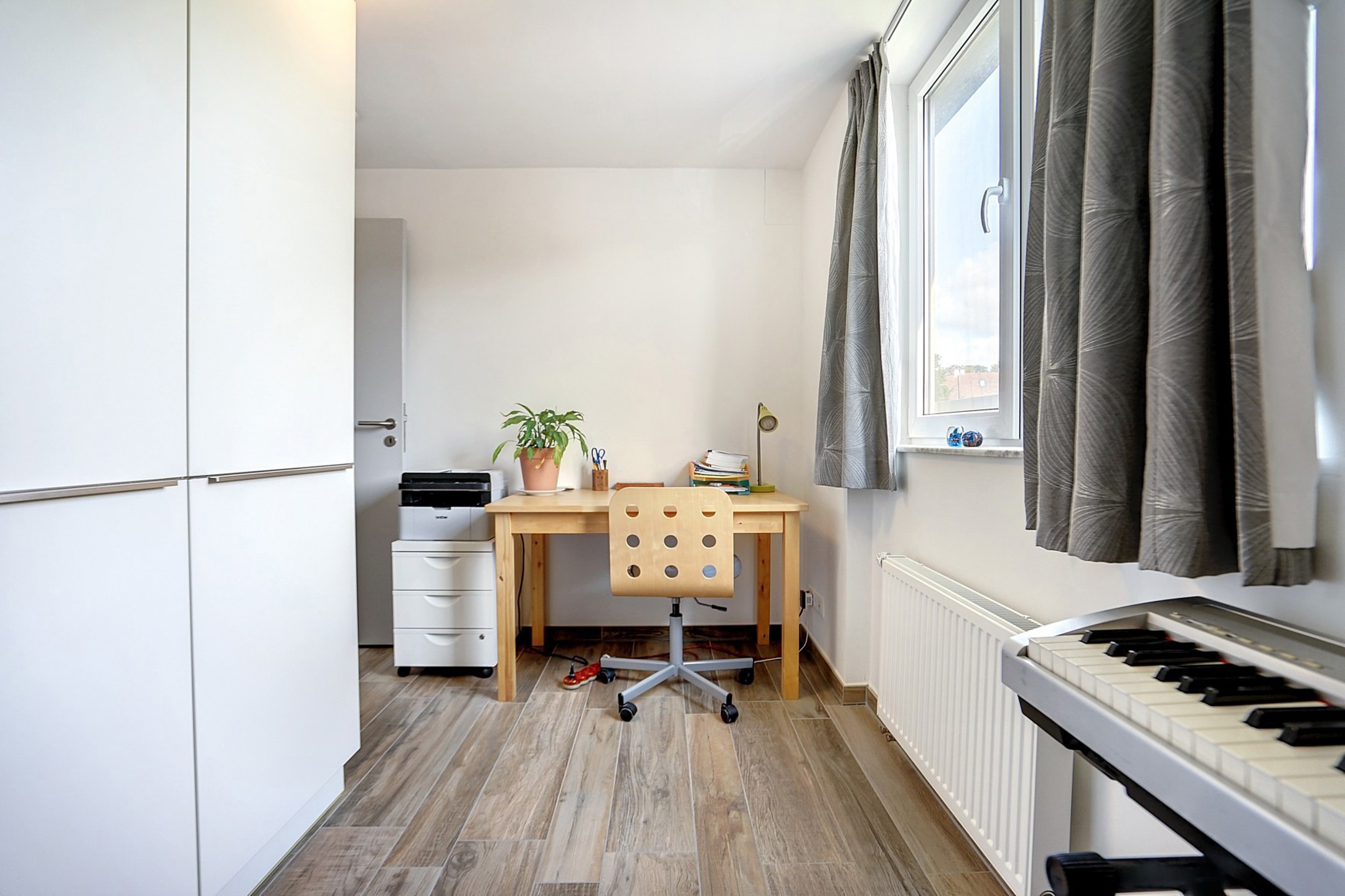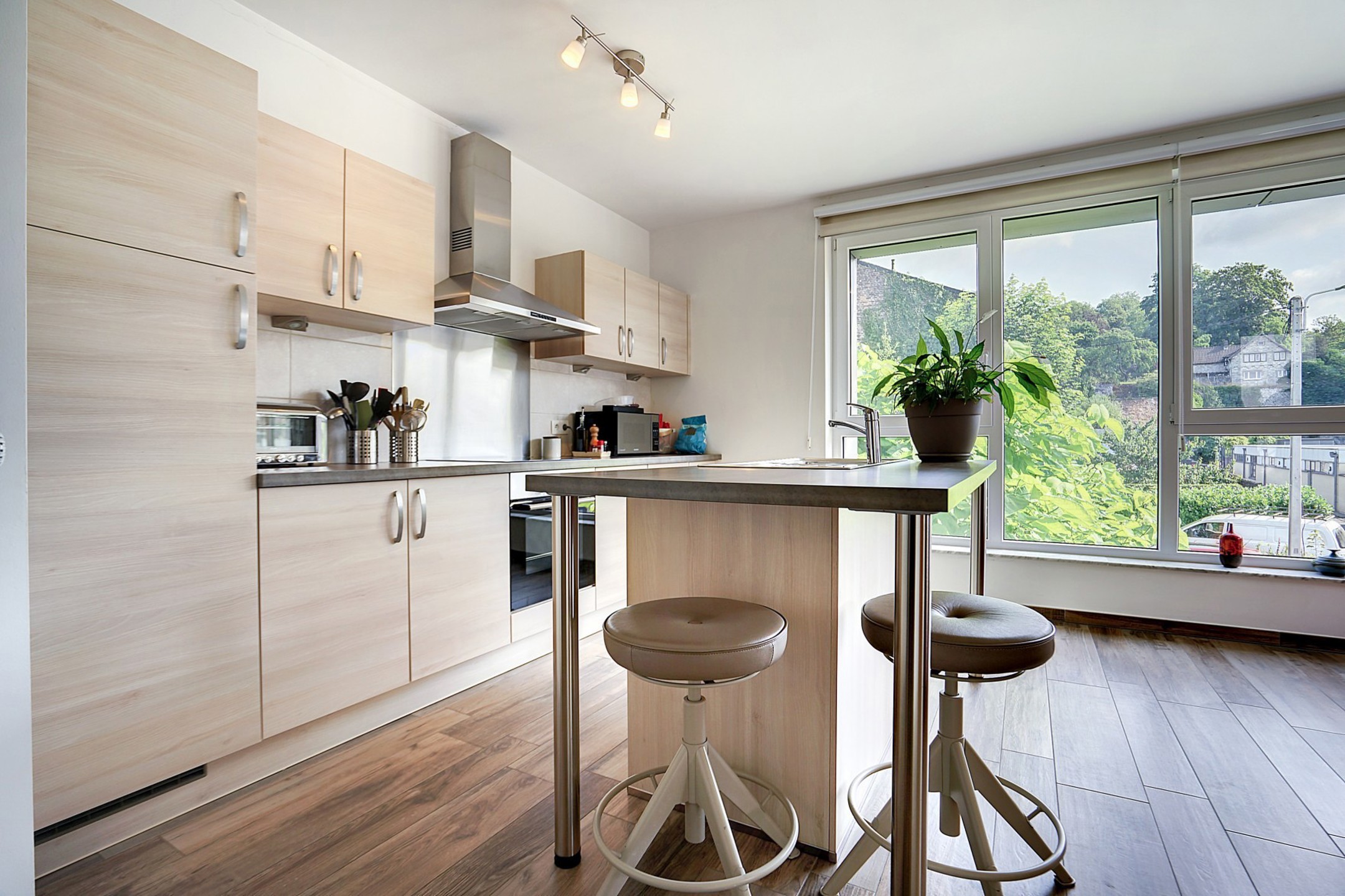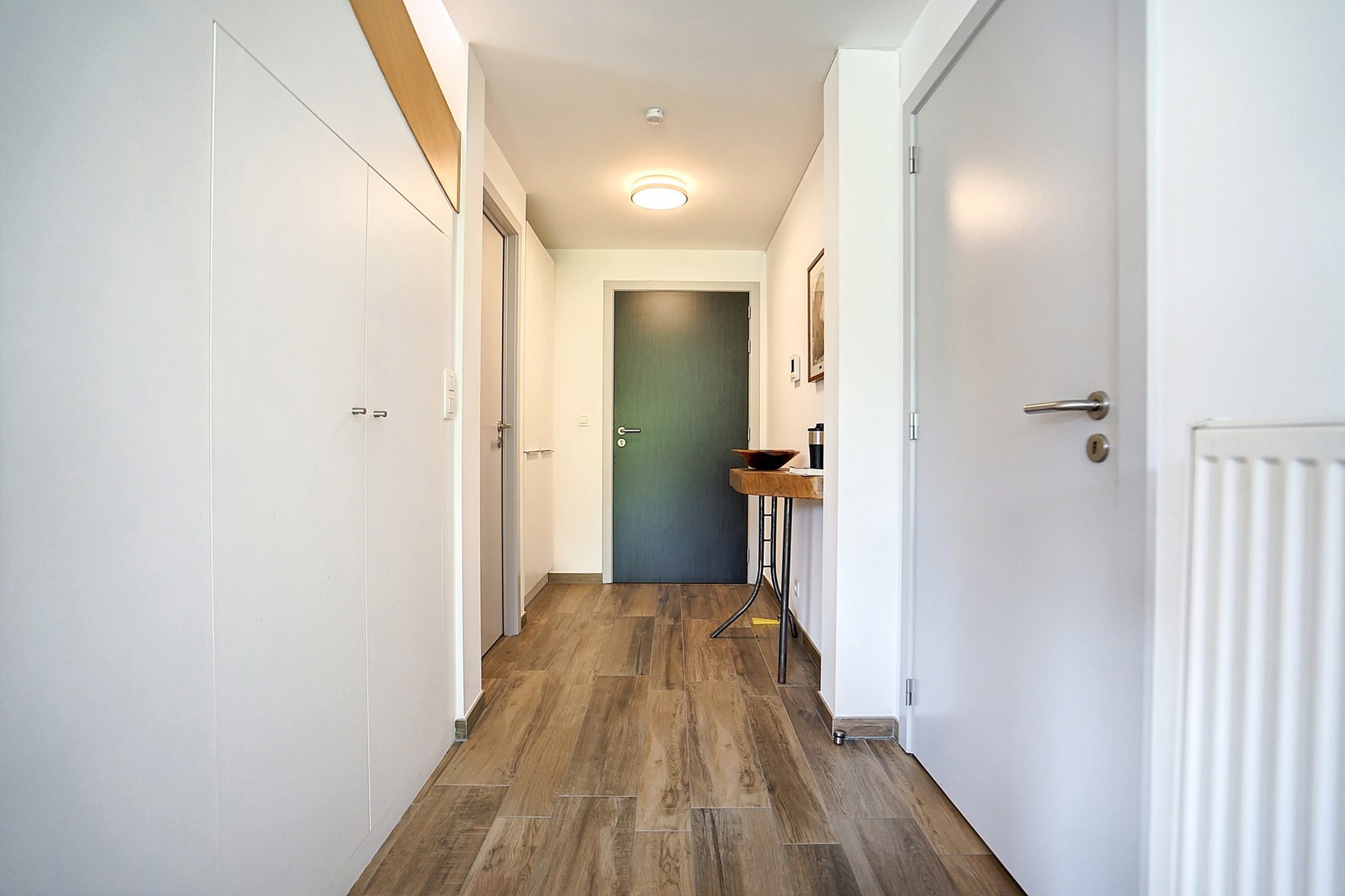 Dans un petit immeuble, très beau duplex de standing de +-106m² composé au 1er niveau de: hall d'entrée, toilette invités, lumineux séjour donnant sur une belle terrasse de +-7m², cuisine US hyper-équipée et buanderie. Nombreux placards de rangement dans le hall d'entrée.