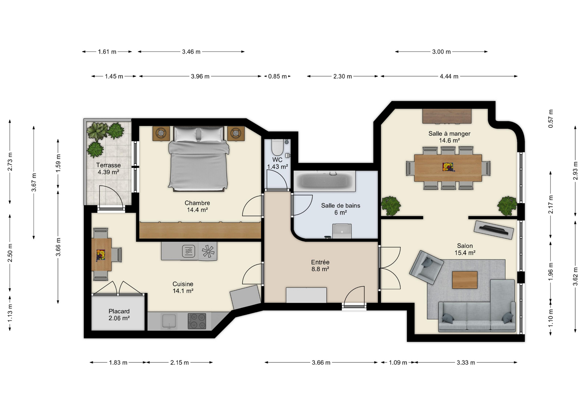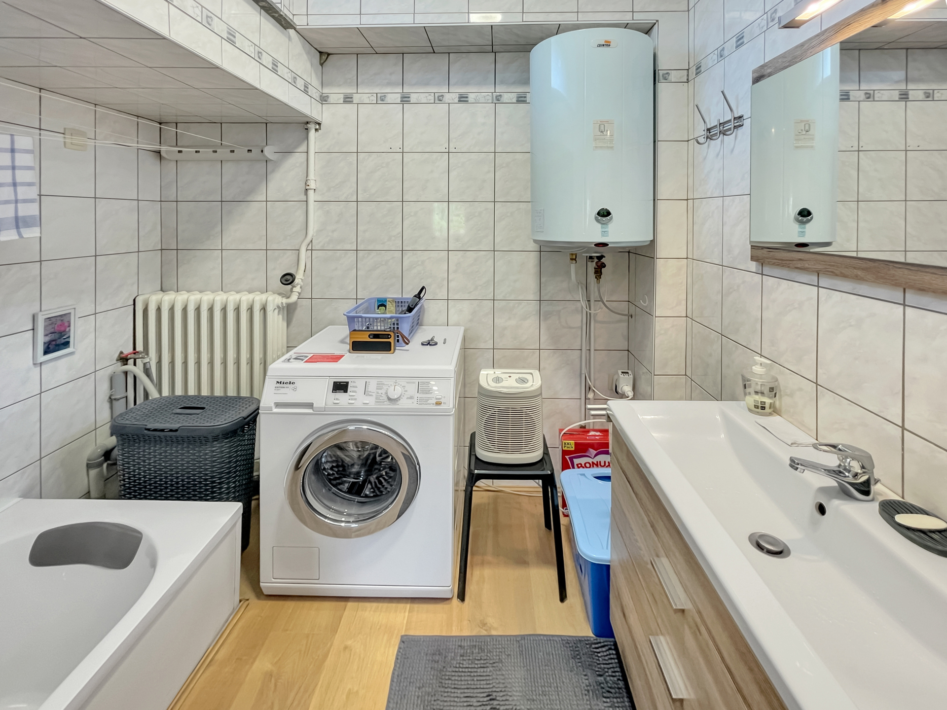 Il se compose d'un spacieux hall d'entrée, un séjour lumineux, une grande chambre, une salle de bain avec baignoire et douche, un water-closet séparé, une très agréable terrasse orientée sud accessible par la cuisine et une cave saine.