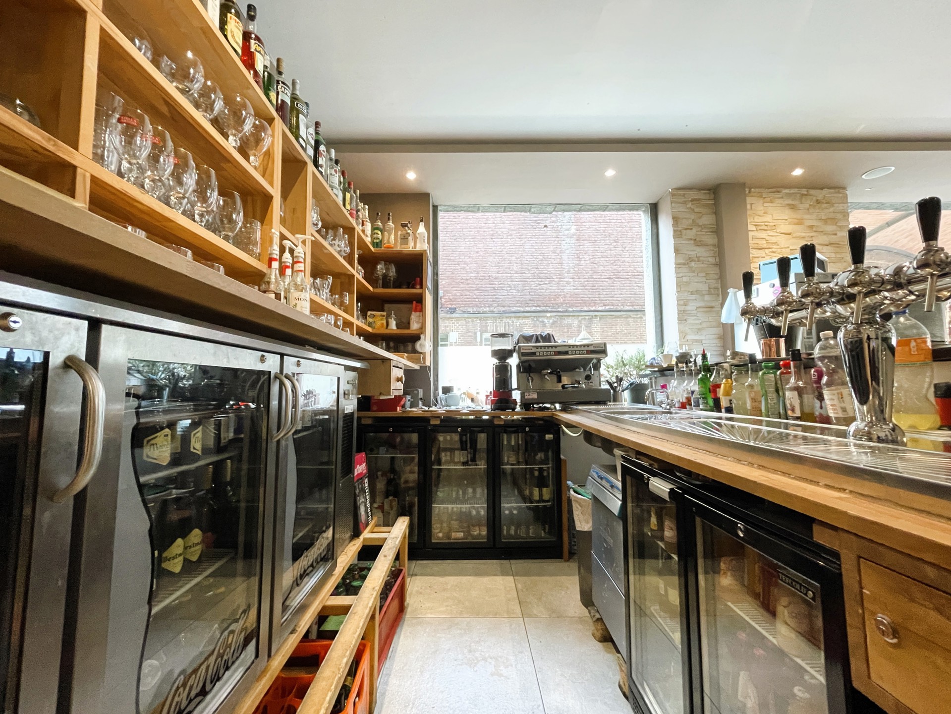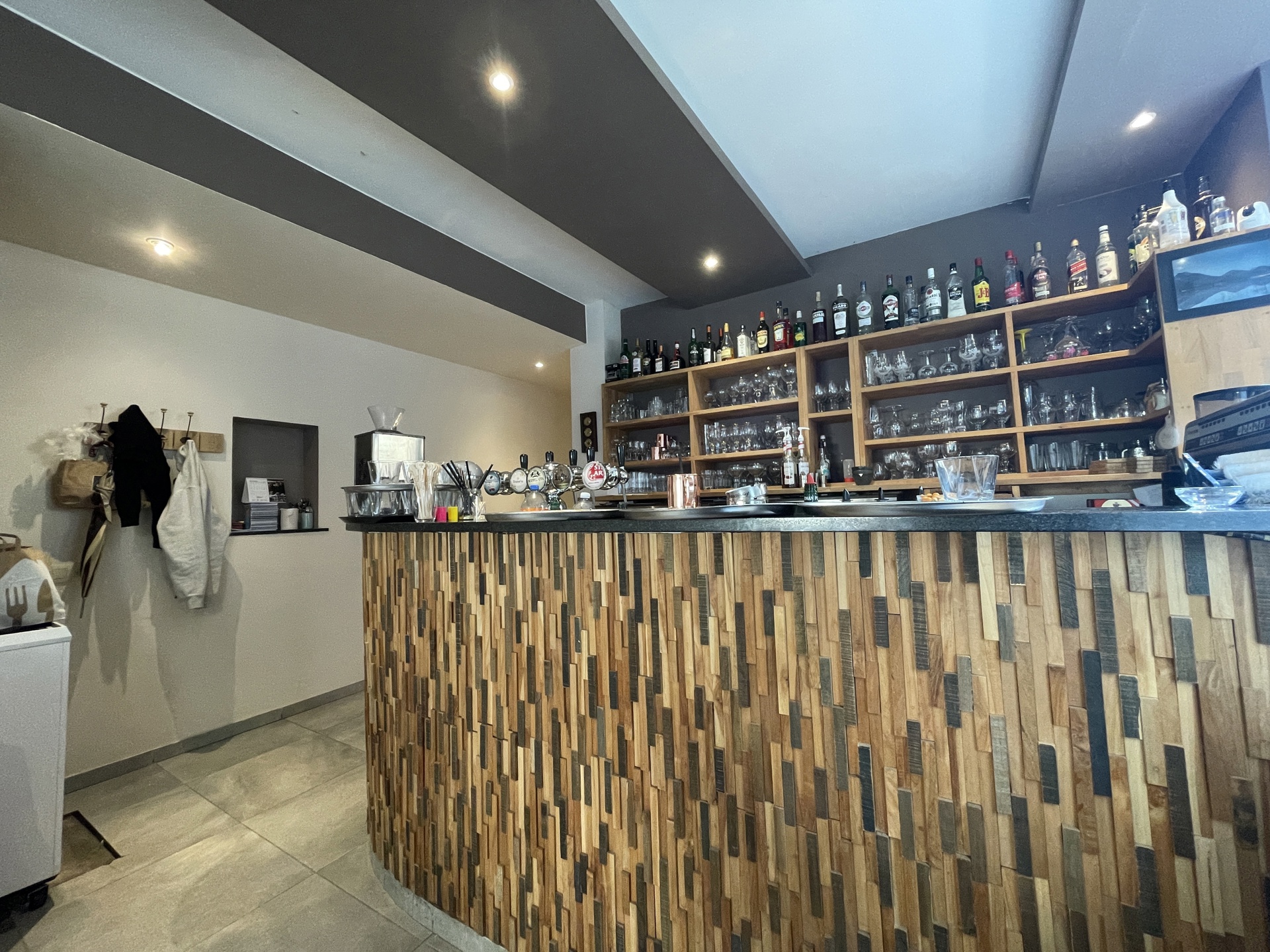 Salle lumineuse avec un agencement fonctionnel, incluant un bar et pouvant accueillir une cinquantaine de couverts.