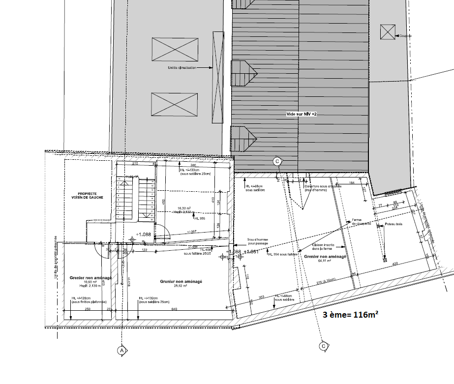 À l’étage, plus de 750 m² de surfaces sont disponibles à la transformation en logements. Le niveau supérieur bénéficie d’un splendide comble voûté avec poutres apparentes, offrant aux futurs acquéreurs la possibilité de créer plusieurs appartements de caractère. Un loft atypique avec terrasse privée de 60 m² y serait également envisageable.