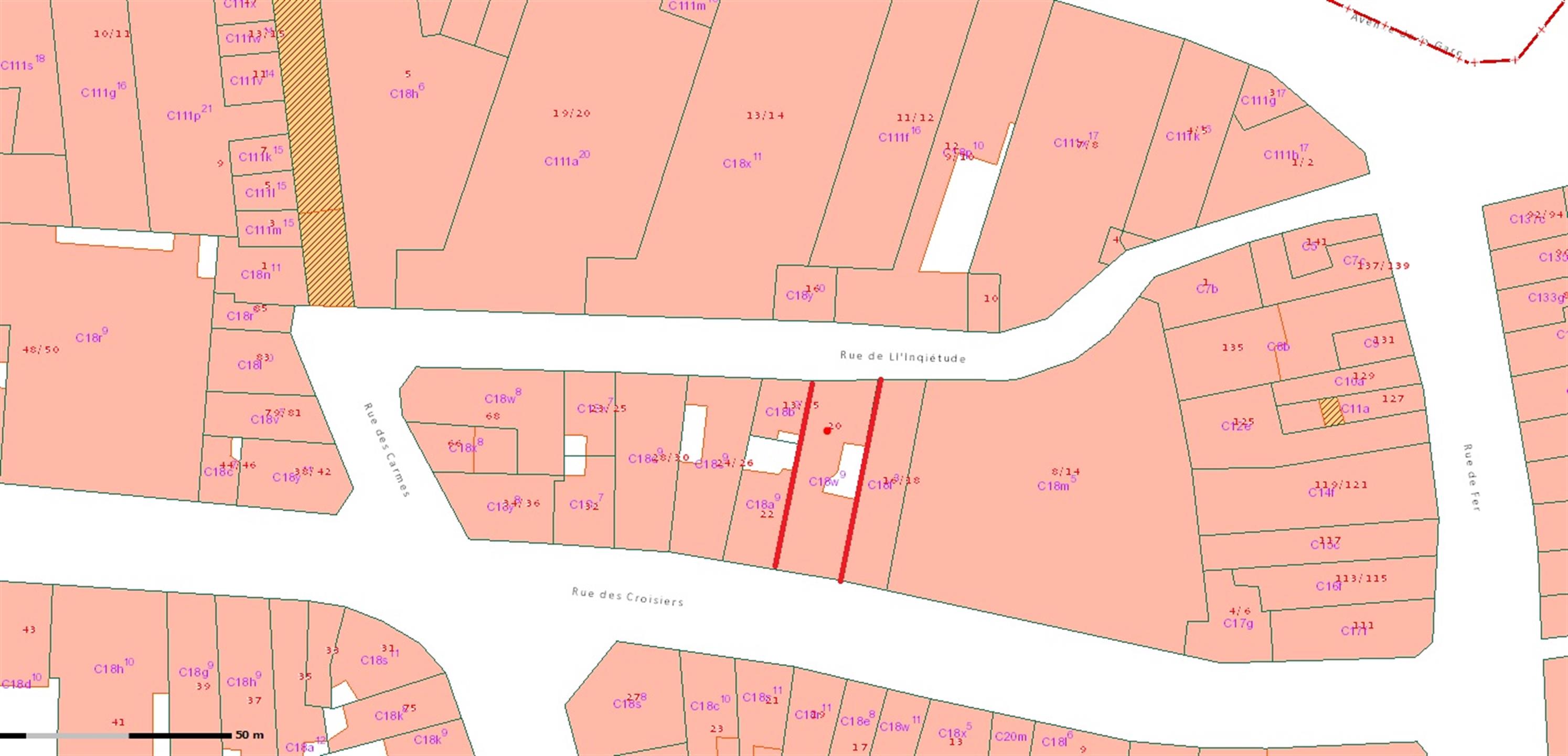 Rue des Croisiers: 2 rez commerciaux de ± 45 m², 1er : appart 1ch de 66 m², 2e : appart 2 ch de 100 m², 3e : appart 2ch de 85 m², 4e : duplex de 65 m² (à régulariser).