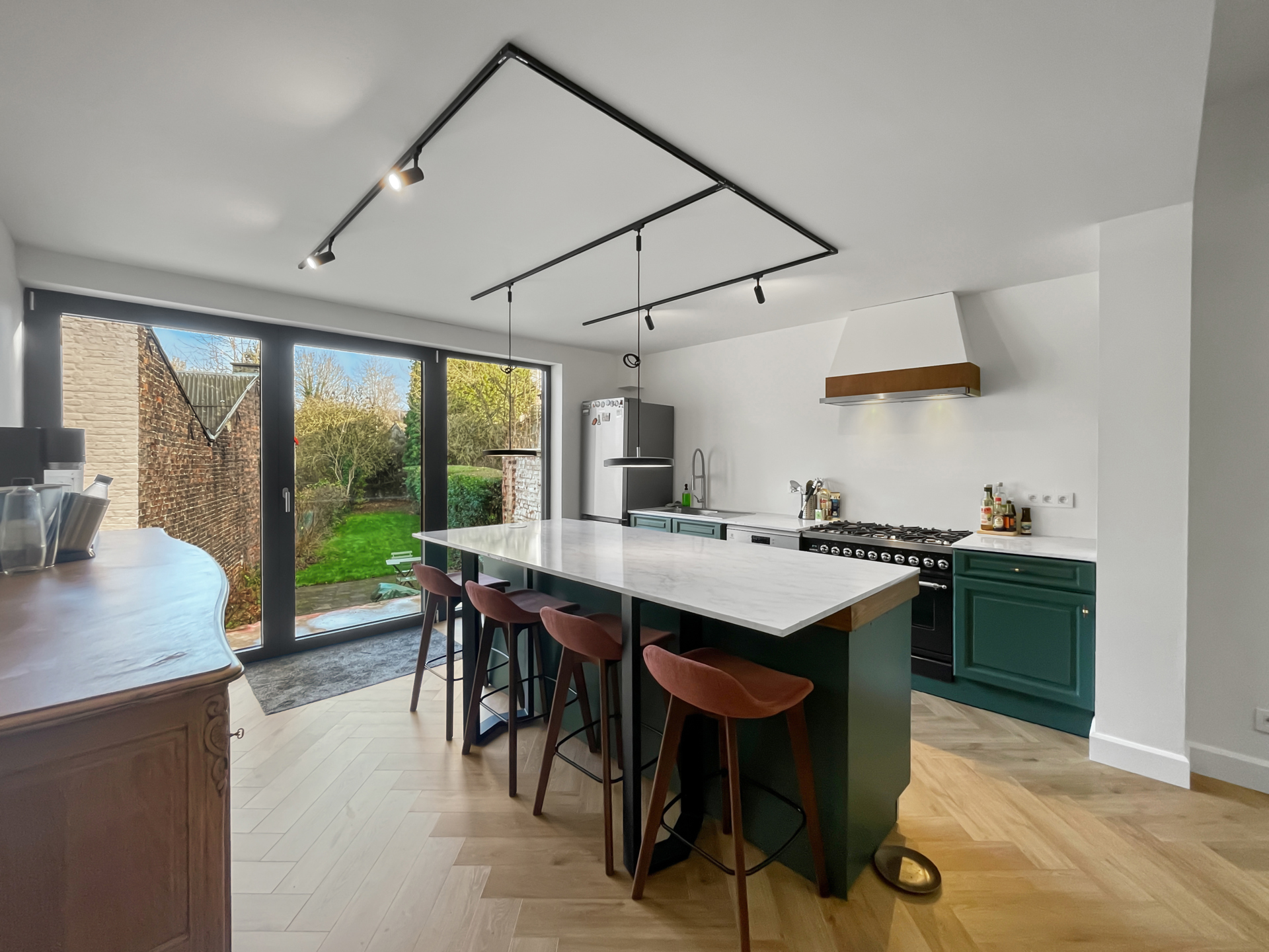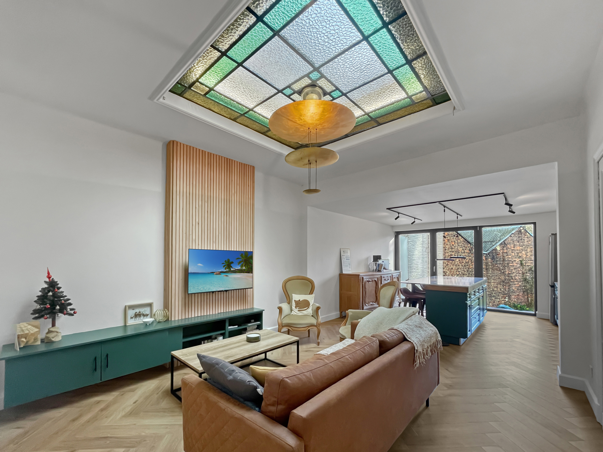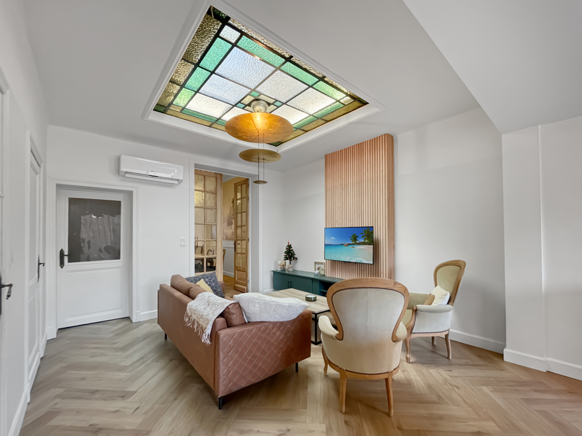 Le séjour est, sublimé par de magnifiques vitraux d’époque mis en valeur par la lumière naturelle et un éclairage soigné, grande cuisine équipée avec un îlot central, véritable espace de convivialité.