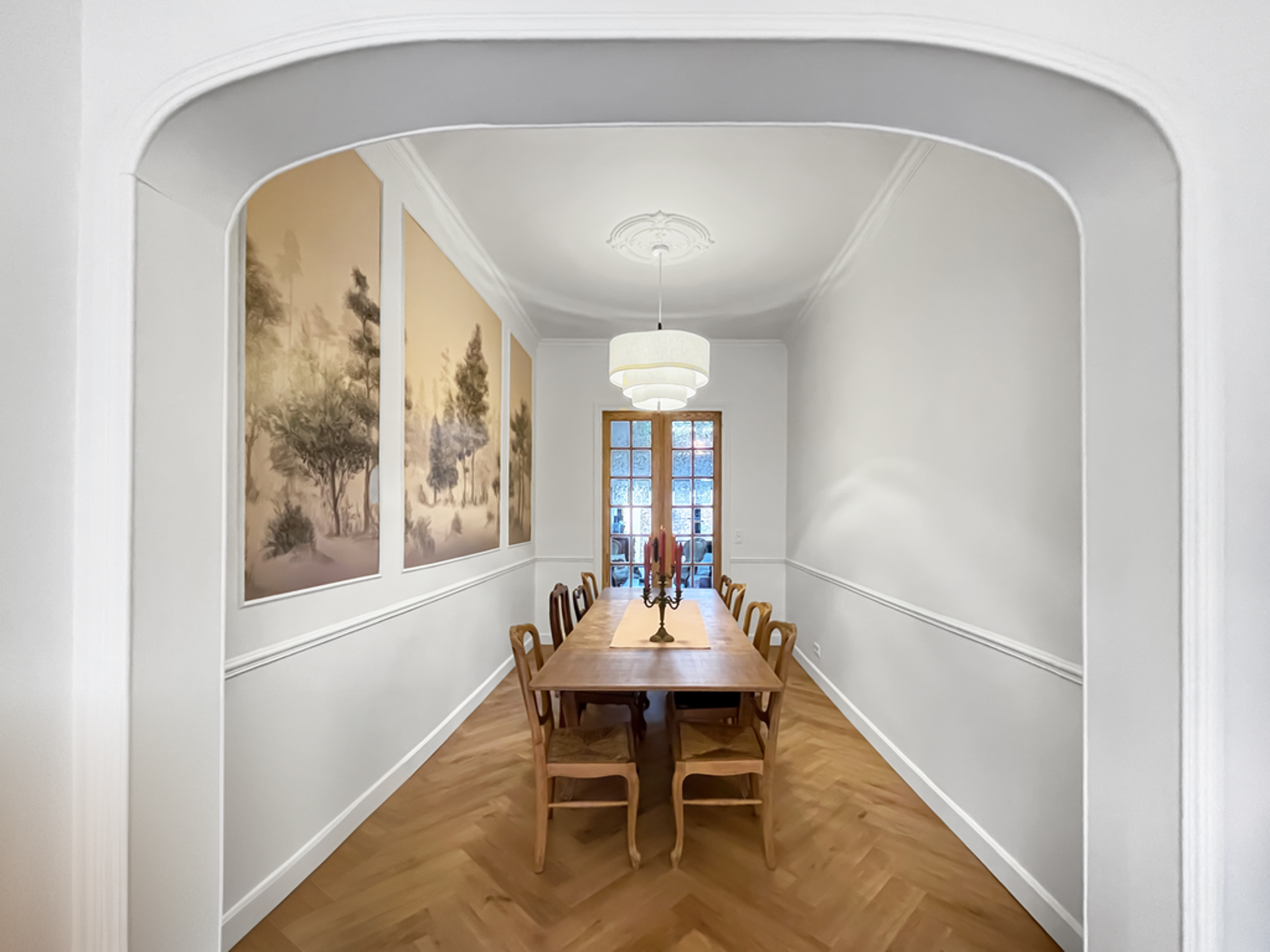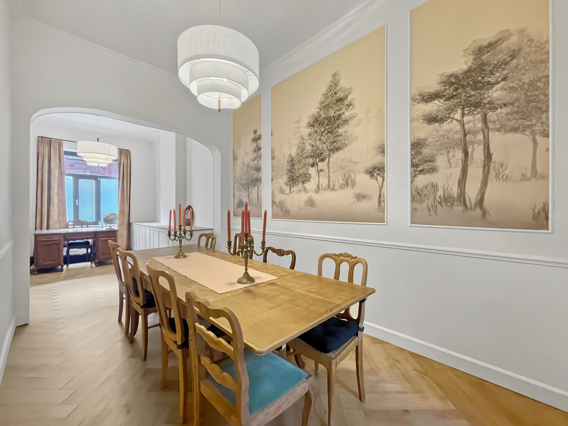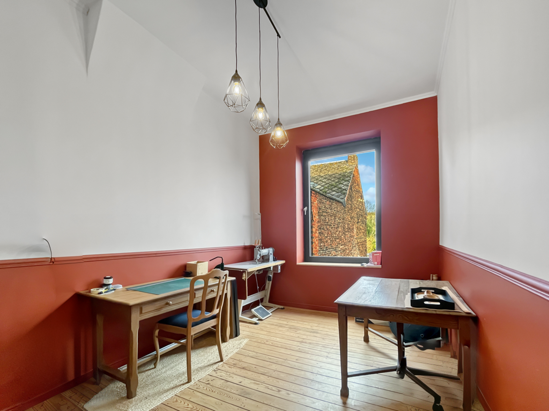 Elle se compose comme suit : spacieux hall d’entrée, vaste salle à manger de 26 m², idéale pour y aménager aisément un espace bureau.