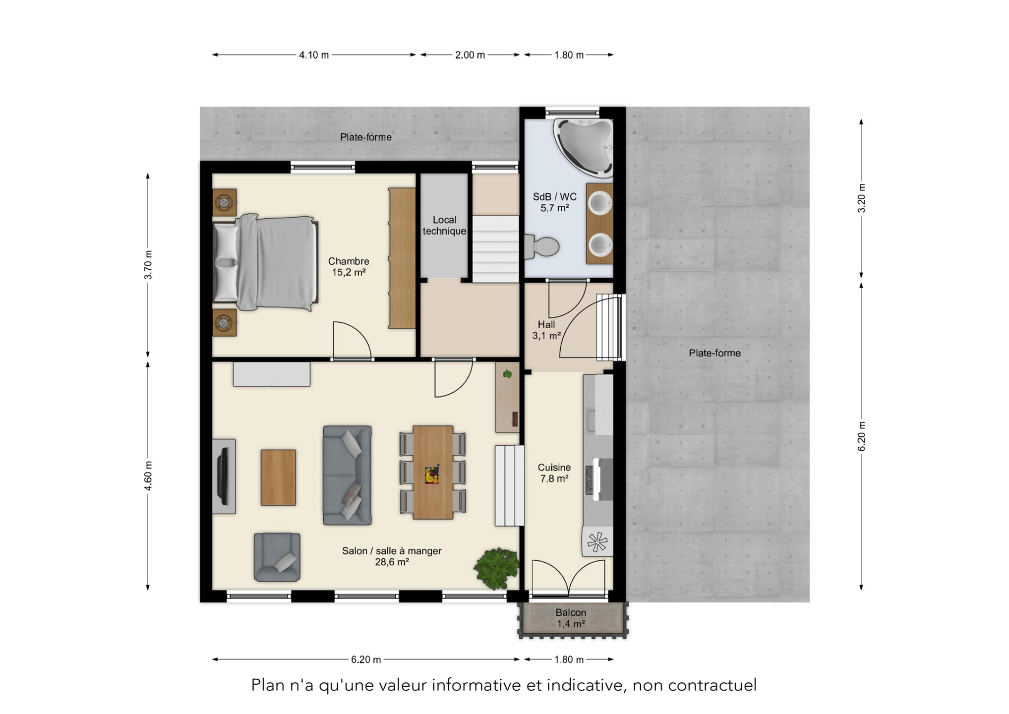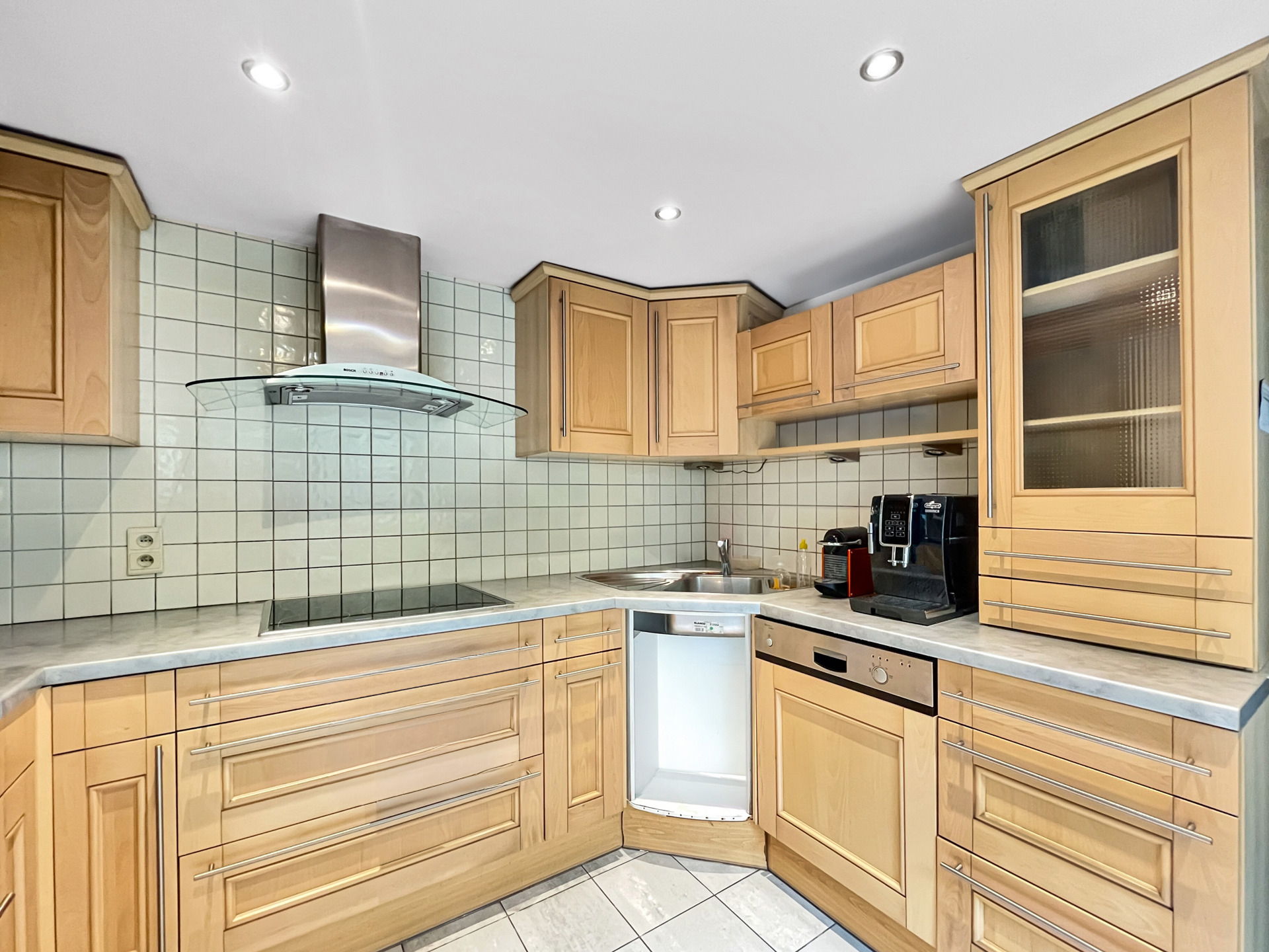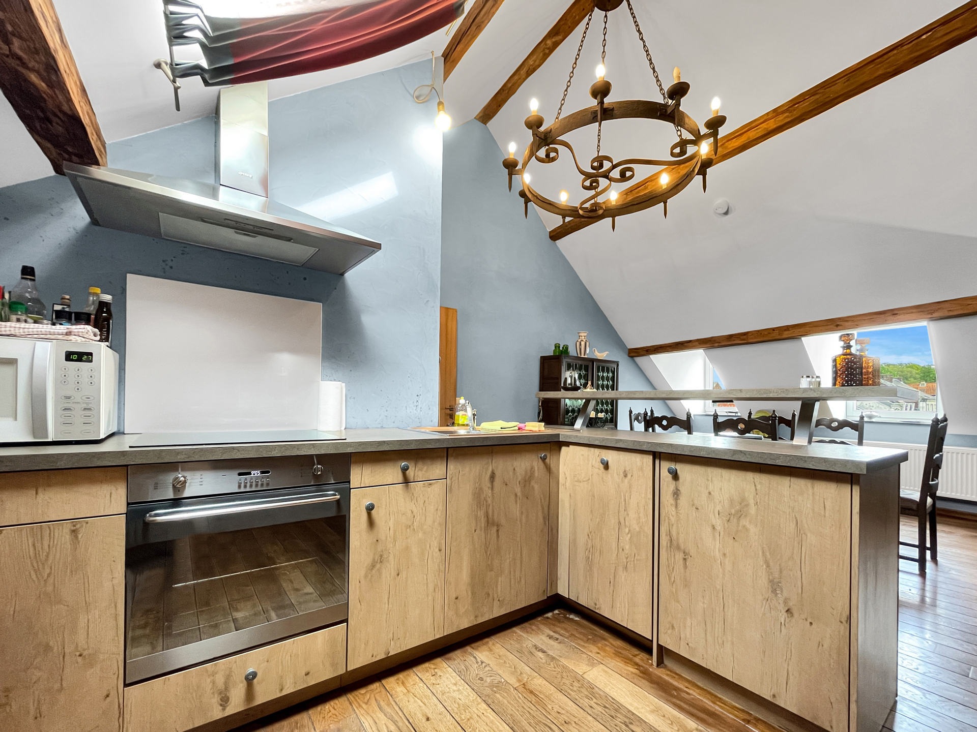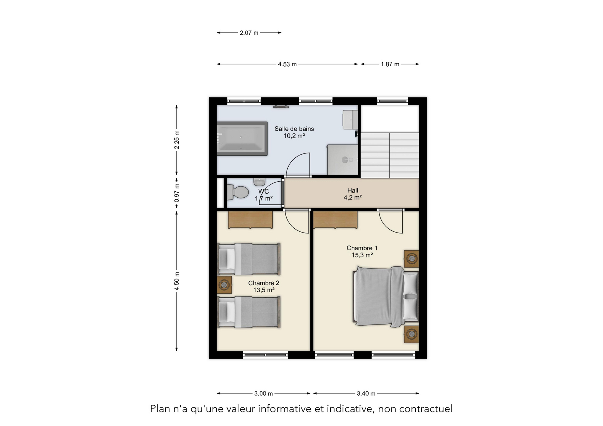 Premier étage : composé d’une chambre, d’une cuisine entièrement équipée, ainsi que d’une salle de bains avec une baignoire balnéo (Aquamass) en coin. Cet étage dispose également d’un hall avec un local technique.