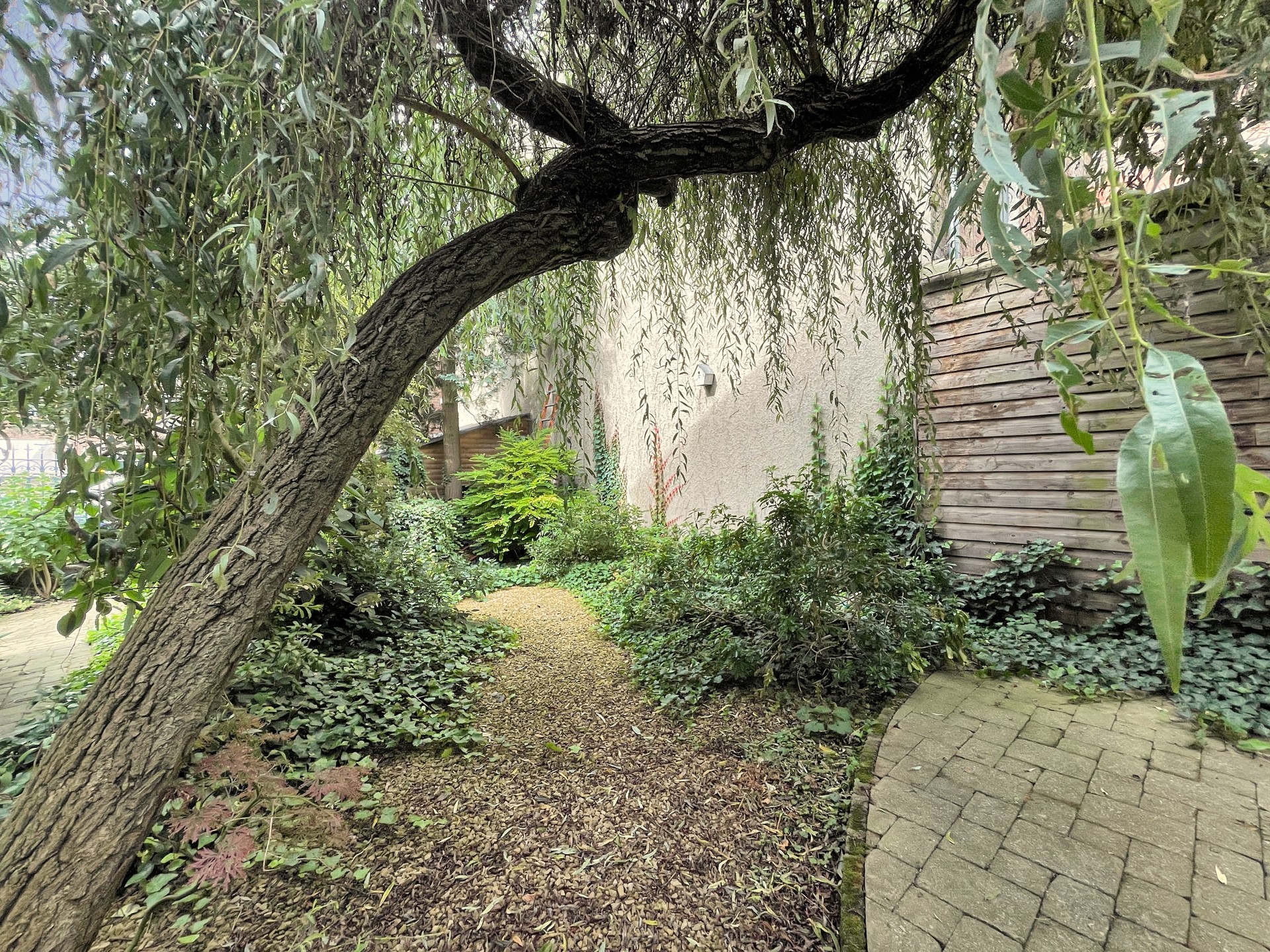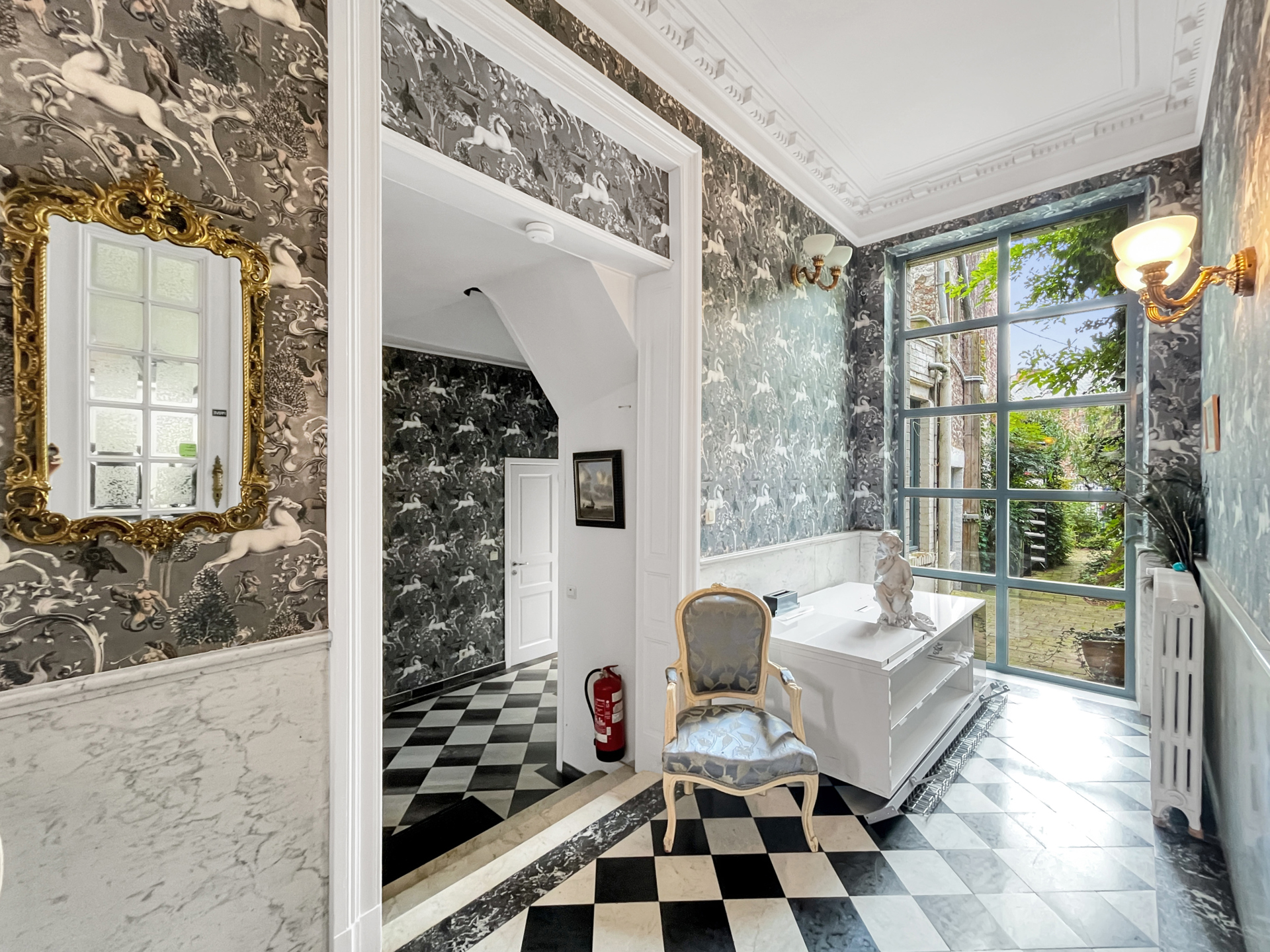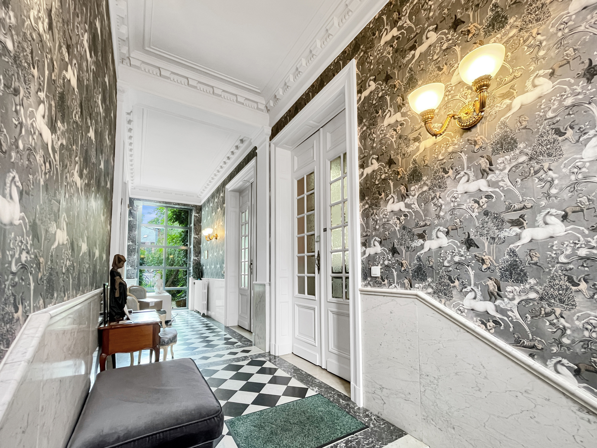 Dès l’entrée vous serez sous le charme ! Un large couloir habillé de marbre de carrare et marbre noir de Mazy mène à deux bureaux, une salle à manger, une cuisine équipée et un agréable jardin de ville arboré, idéal pour une pause en plein air.