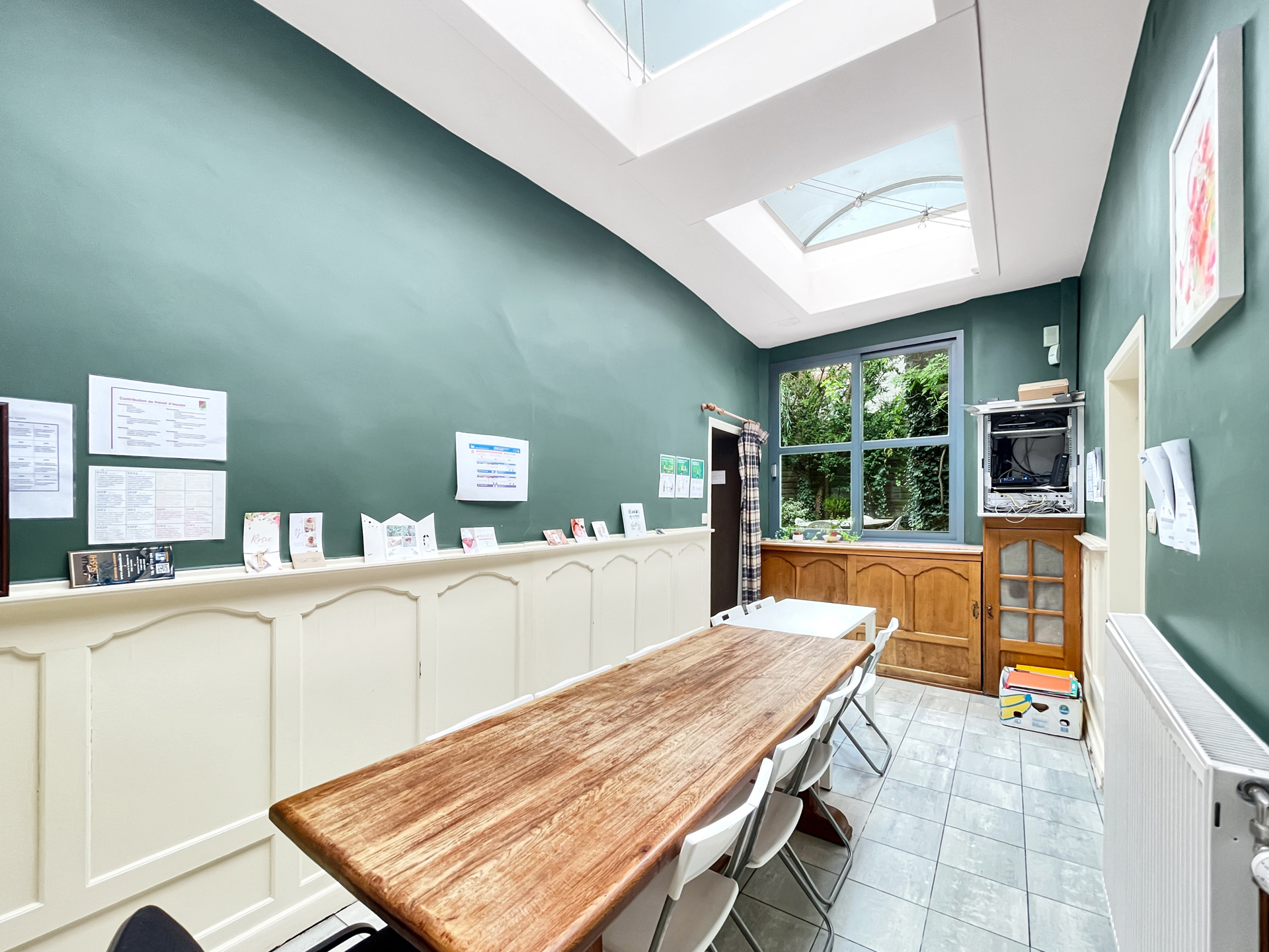 Les salon et salle-à manger offrent un vaste espace lumineux, occupé actuellement par des bureaux. Une porte-fenêtre offre un accès direct sur le jardin et le parking privé.