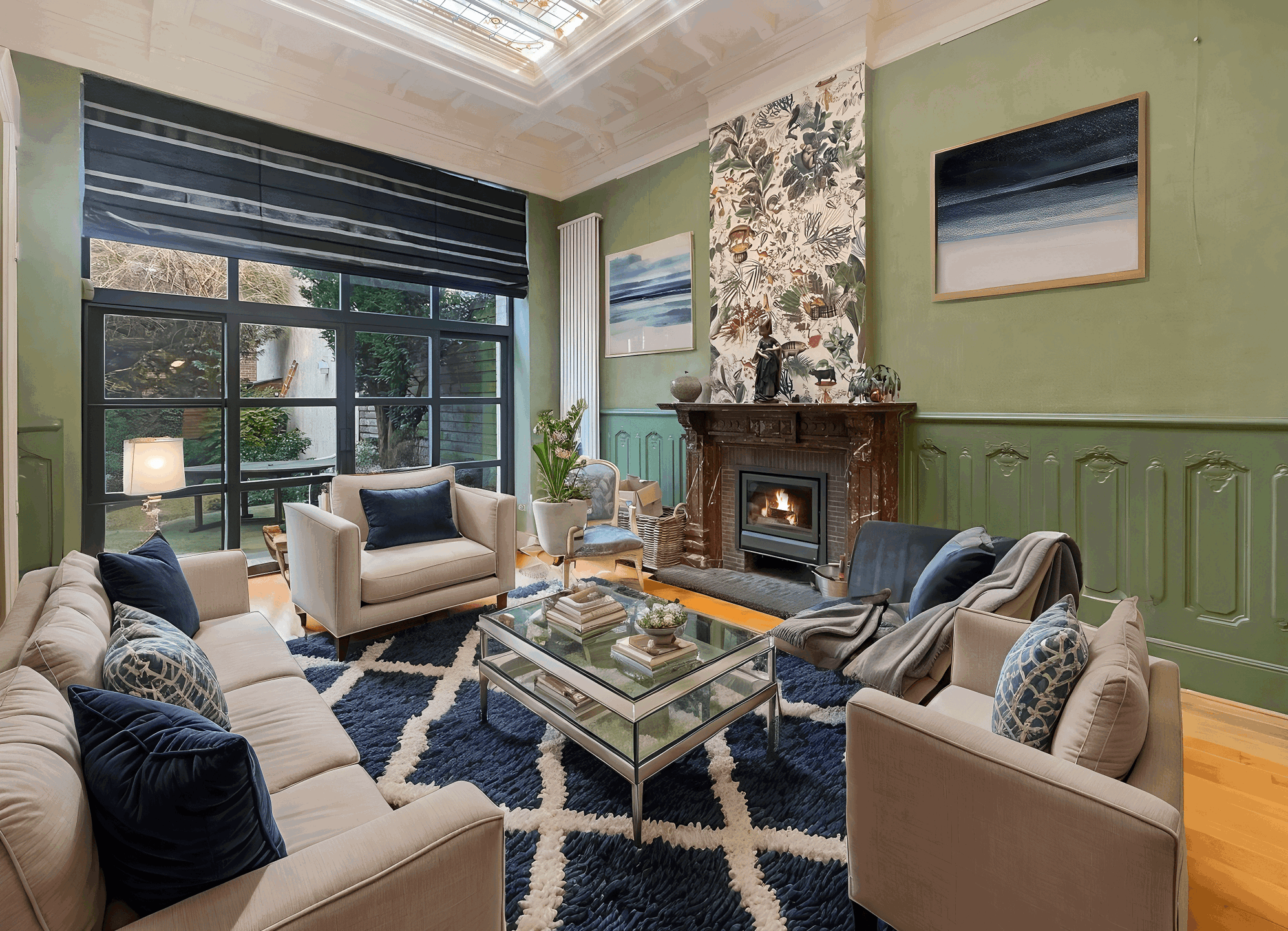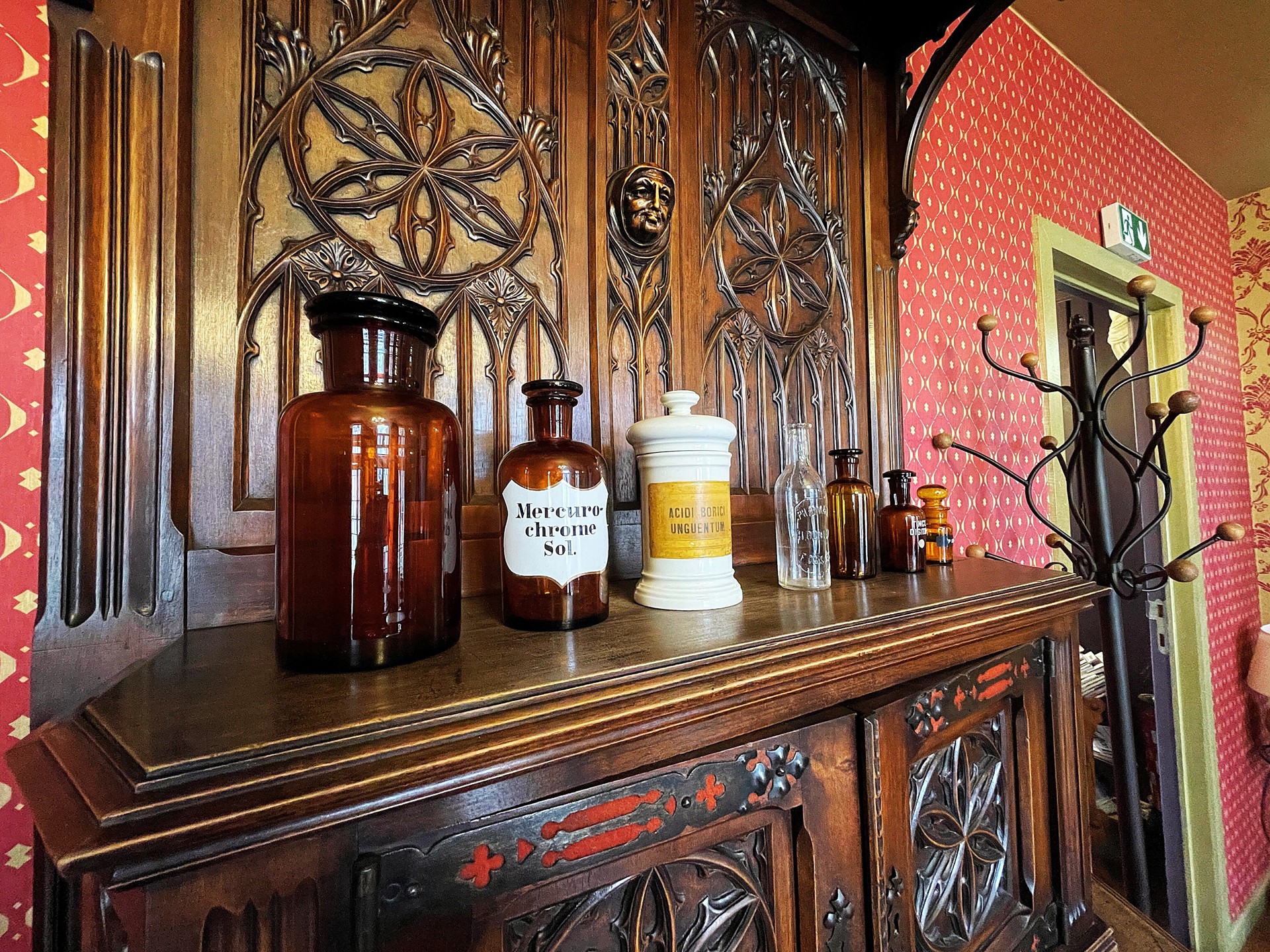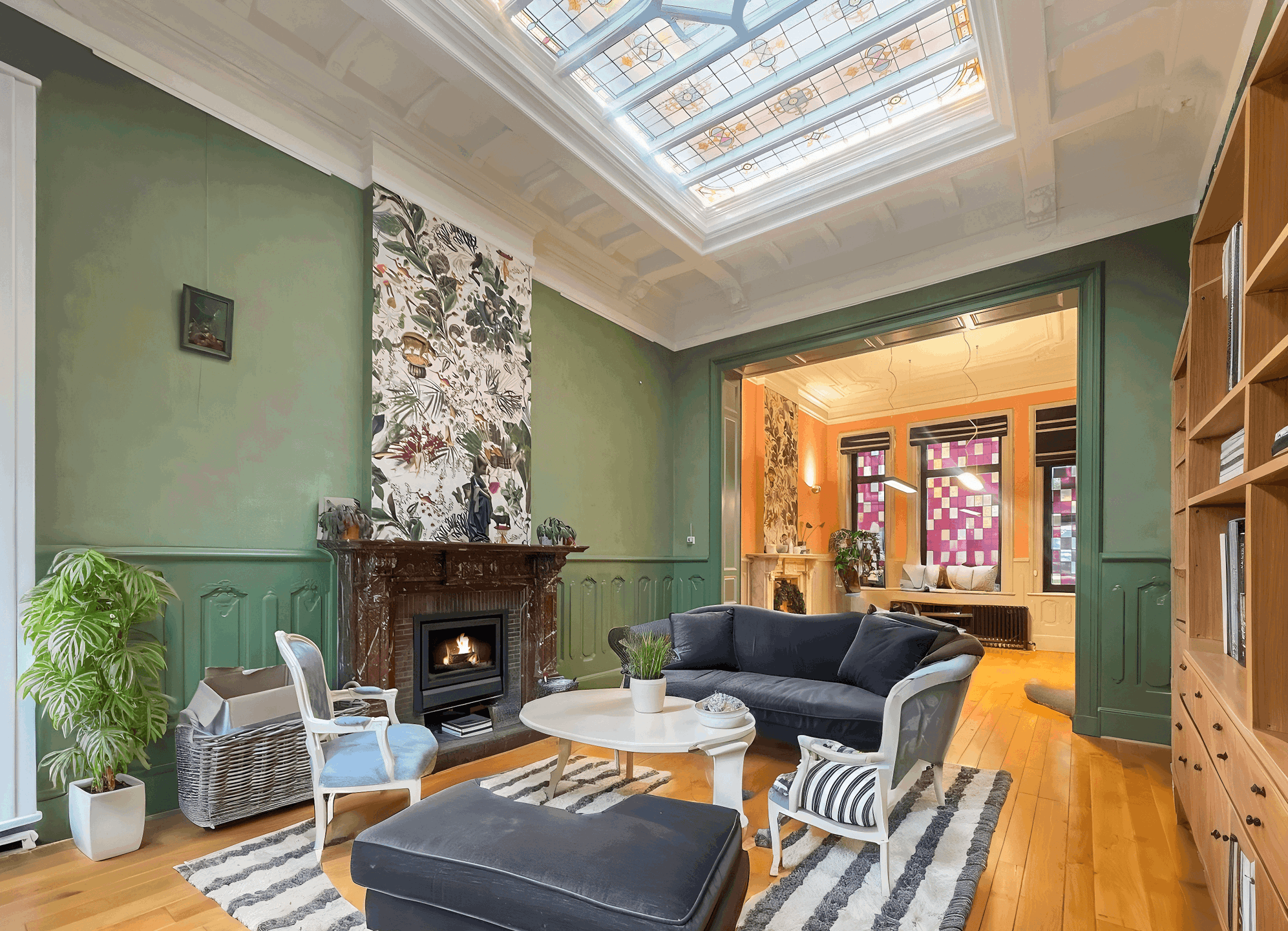 Les plafonds sont décorés de moulures en parfait état et de majestueux vitraux. Les verres colorés des fenêtres du rez de chaussée ont été récemment restaurés.