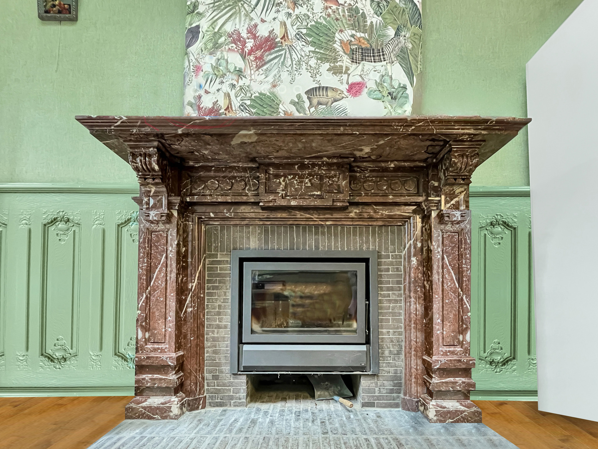 Cette belle pièce comporte deux magnifiques cheminées de marbre dont l’une habille une cassette à bois fonctionnelle.
