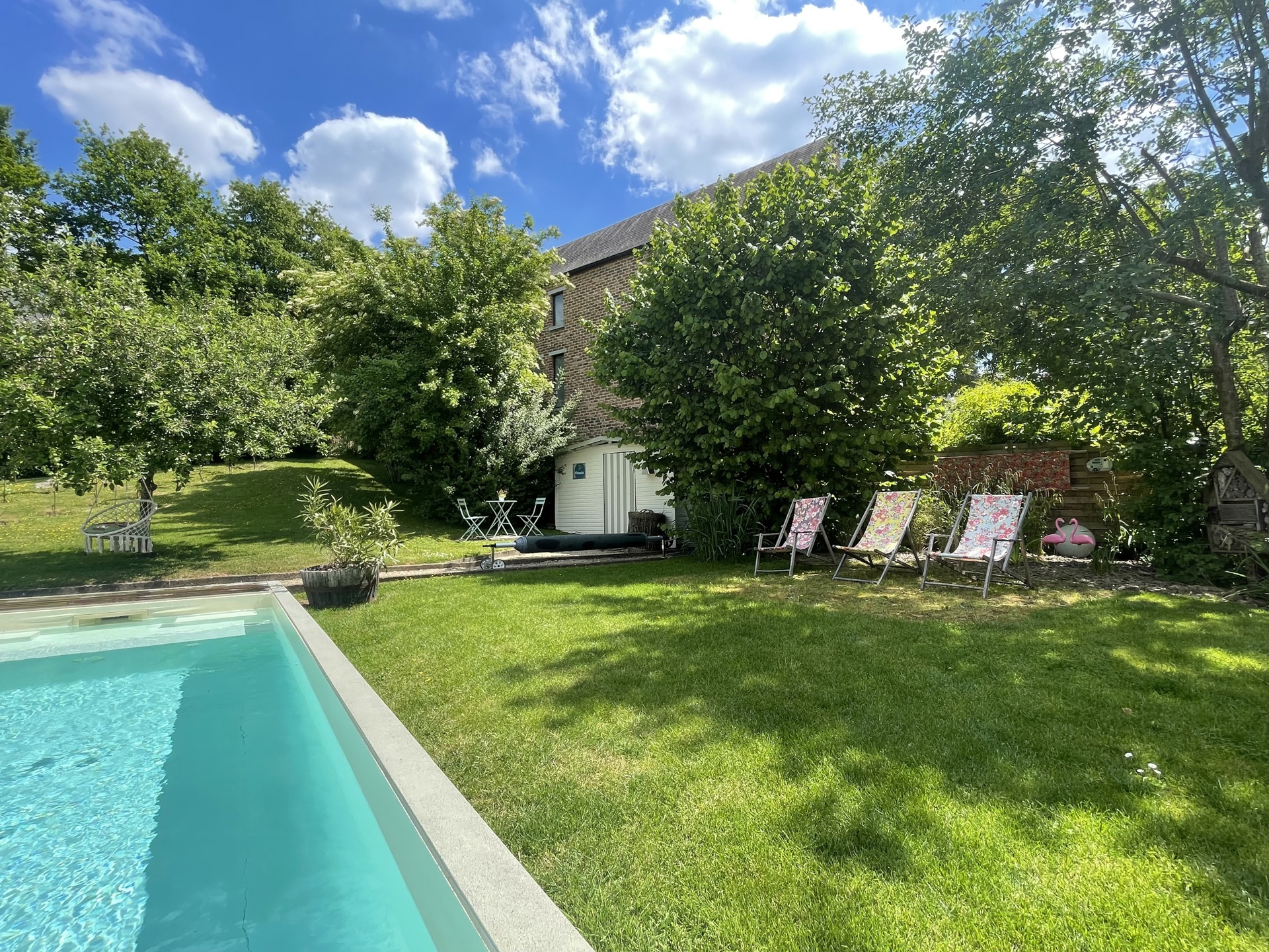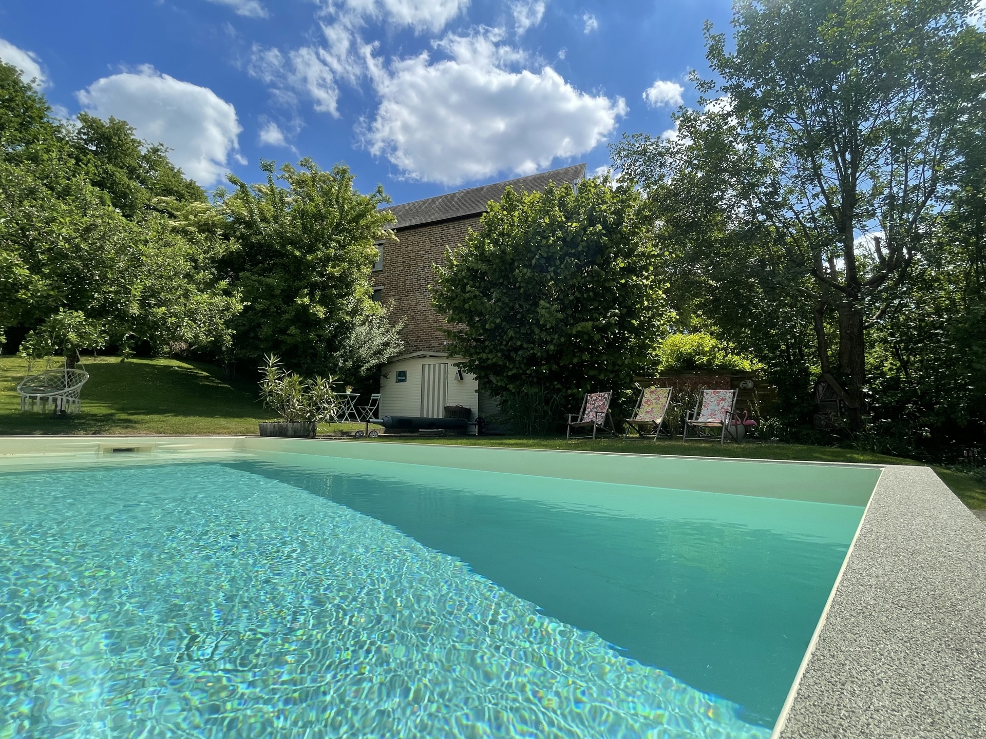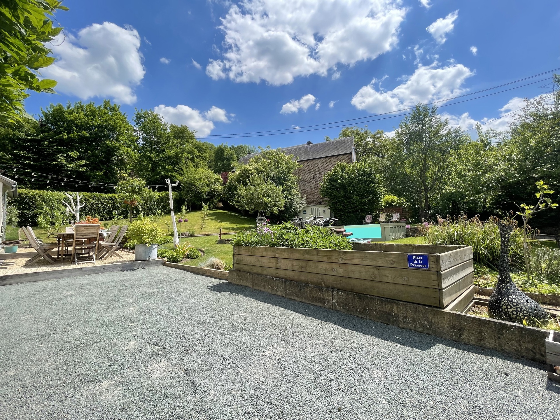 À l’extérieur, le jardin d’environ 10 ares, exposé plein sud, est un véritable havre de paix. Arboré, bordé par un ruisseau, il est agrémenté d’une piscine au charme atypique et d’un bar de plage, invitant à la détente et à la convivialité.