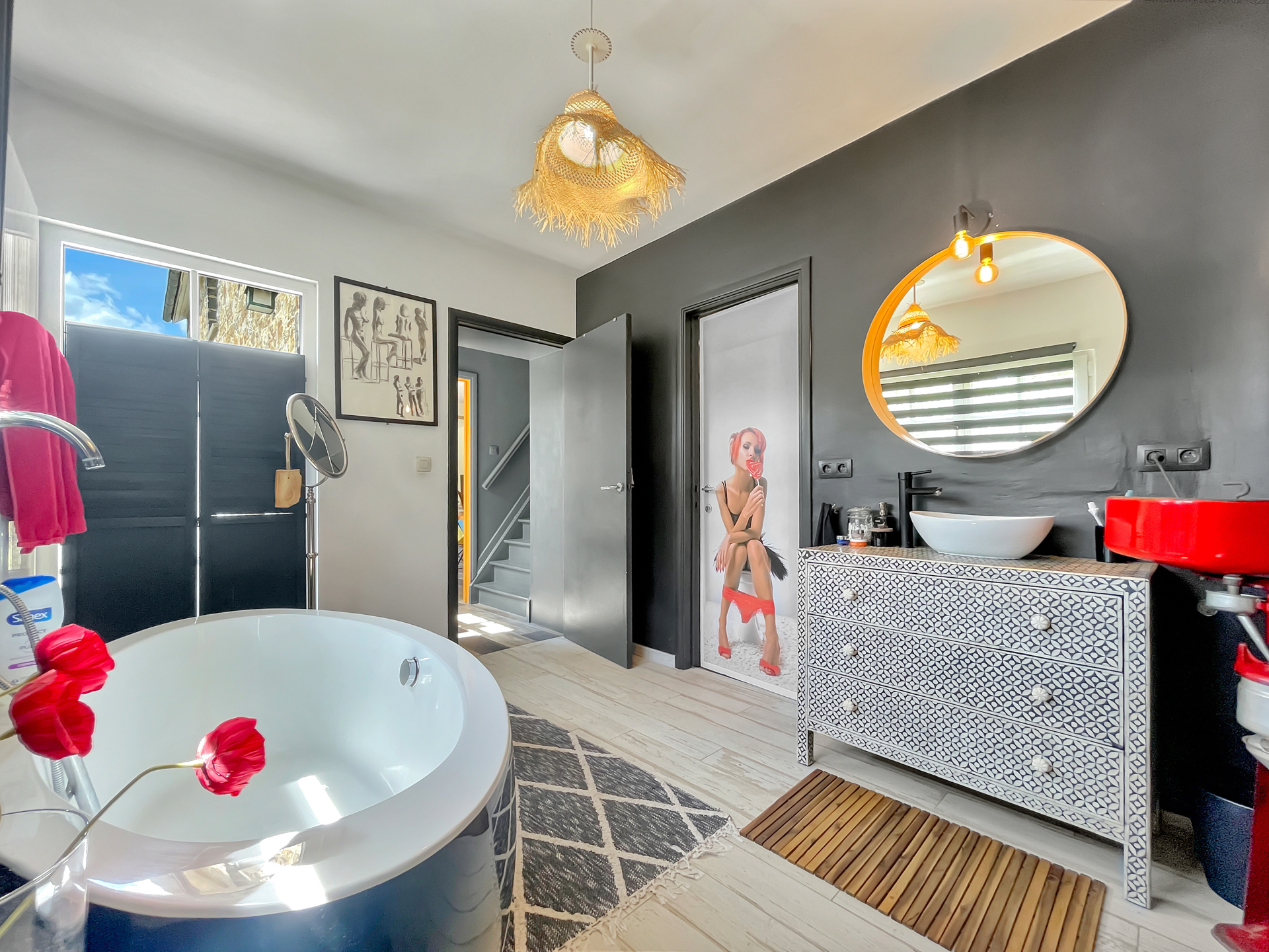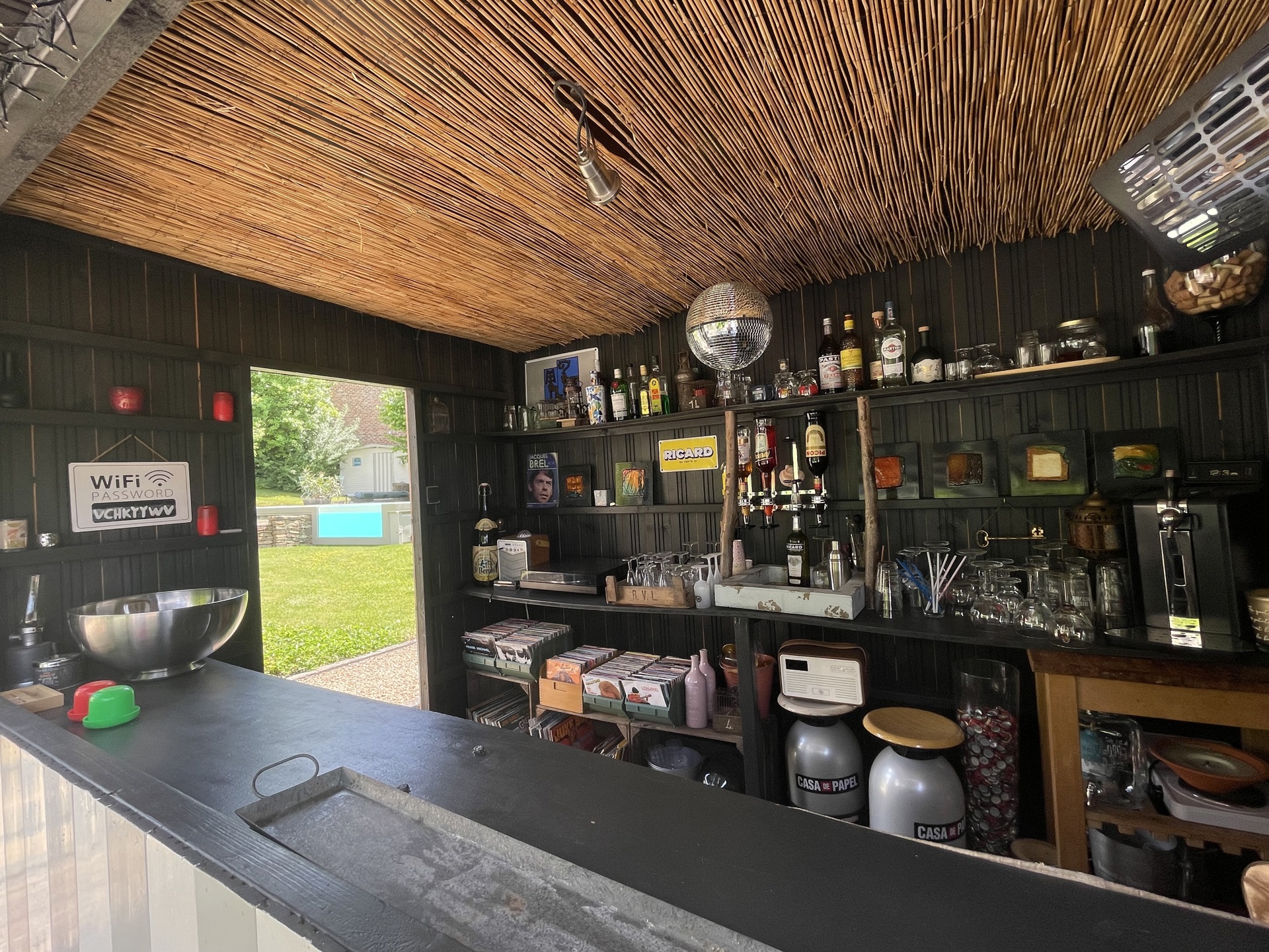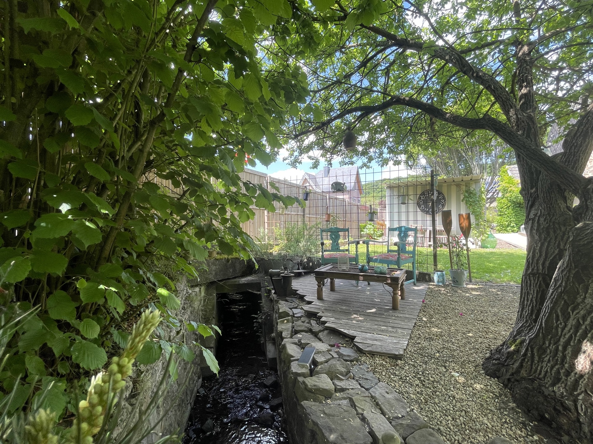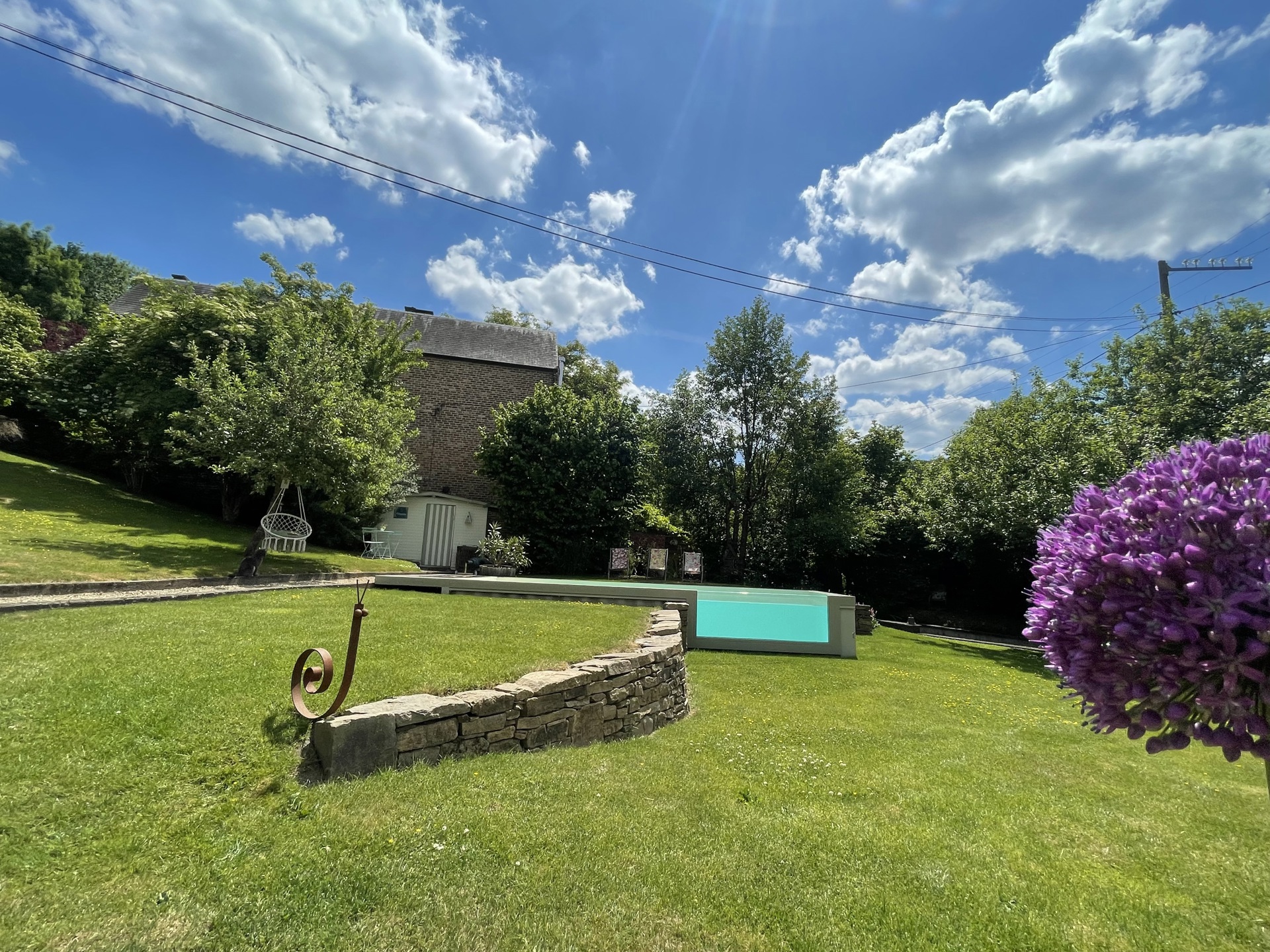À l’extérieur, le jardin d’environ 10 ares, exposé plein sud, est un véritable havre de paix. Arboré, bordé par un ruisseau, il est agrémenté d’une piscine au charme atypique et d’un bar de plage, invitant à la détente et à la convivialité.