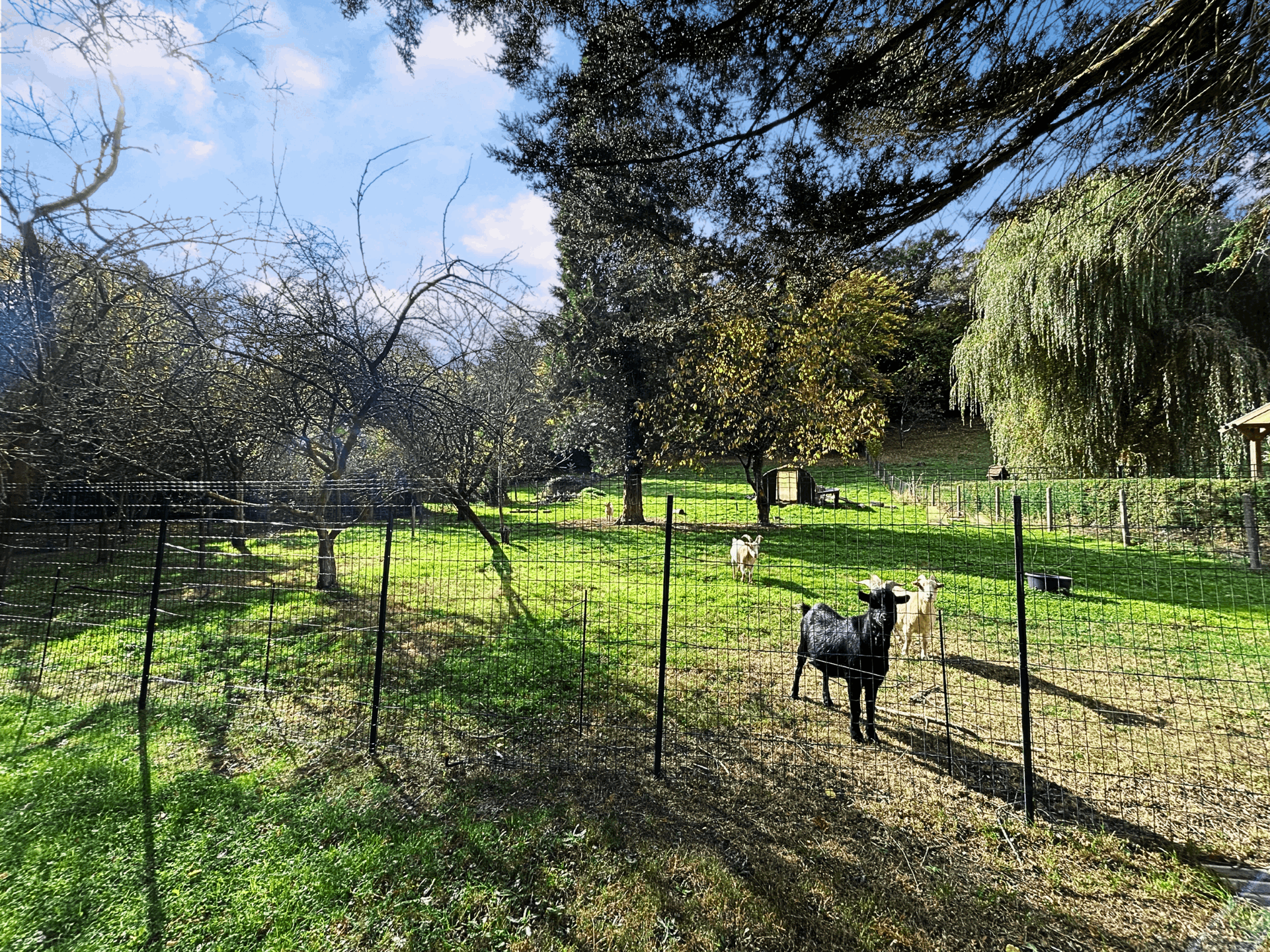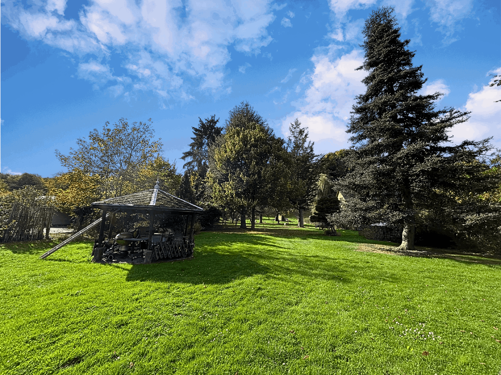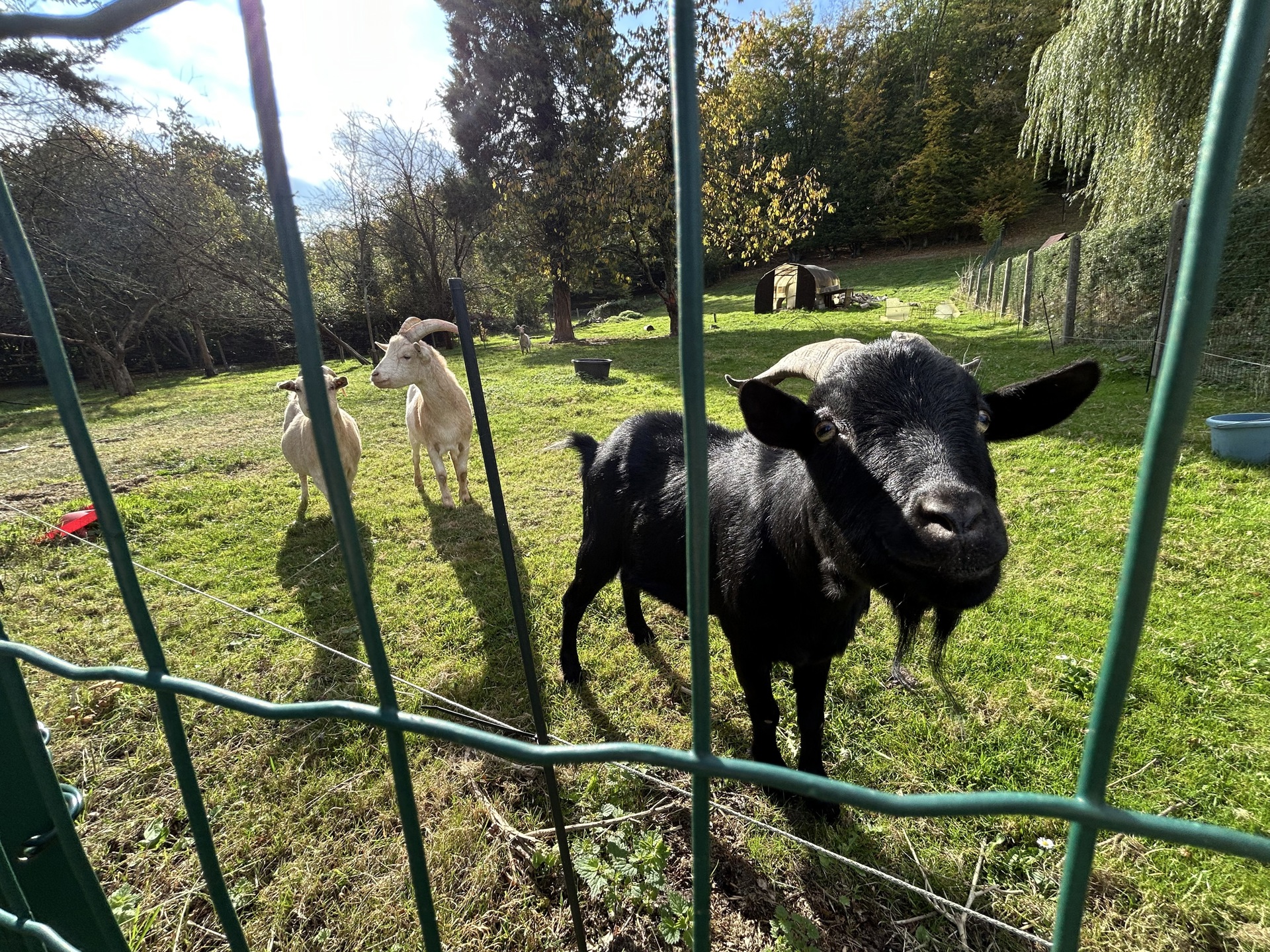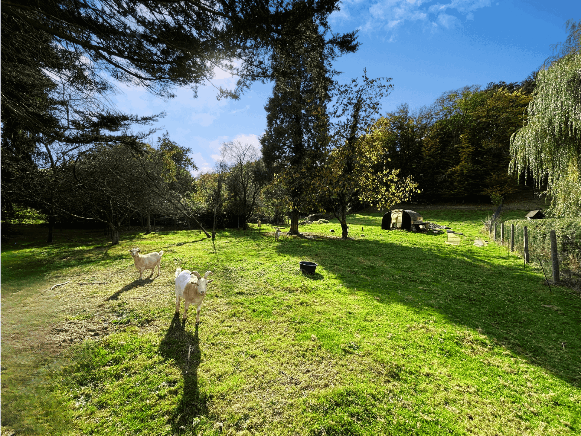 À l’extérieur, vous profiterez d’un magnifique jardin arboré, agrémenté d’une gloriette, d’un abri de jardin, d’un rangement à bois, et d’un bel espace actuellement occupé par quelques biquettes 😉.