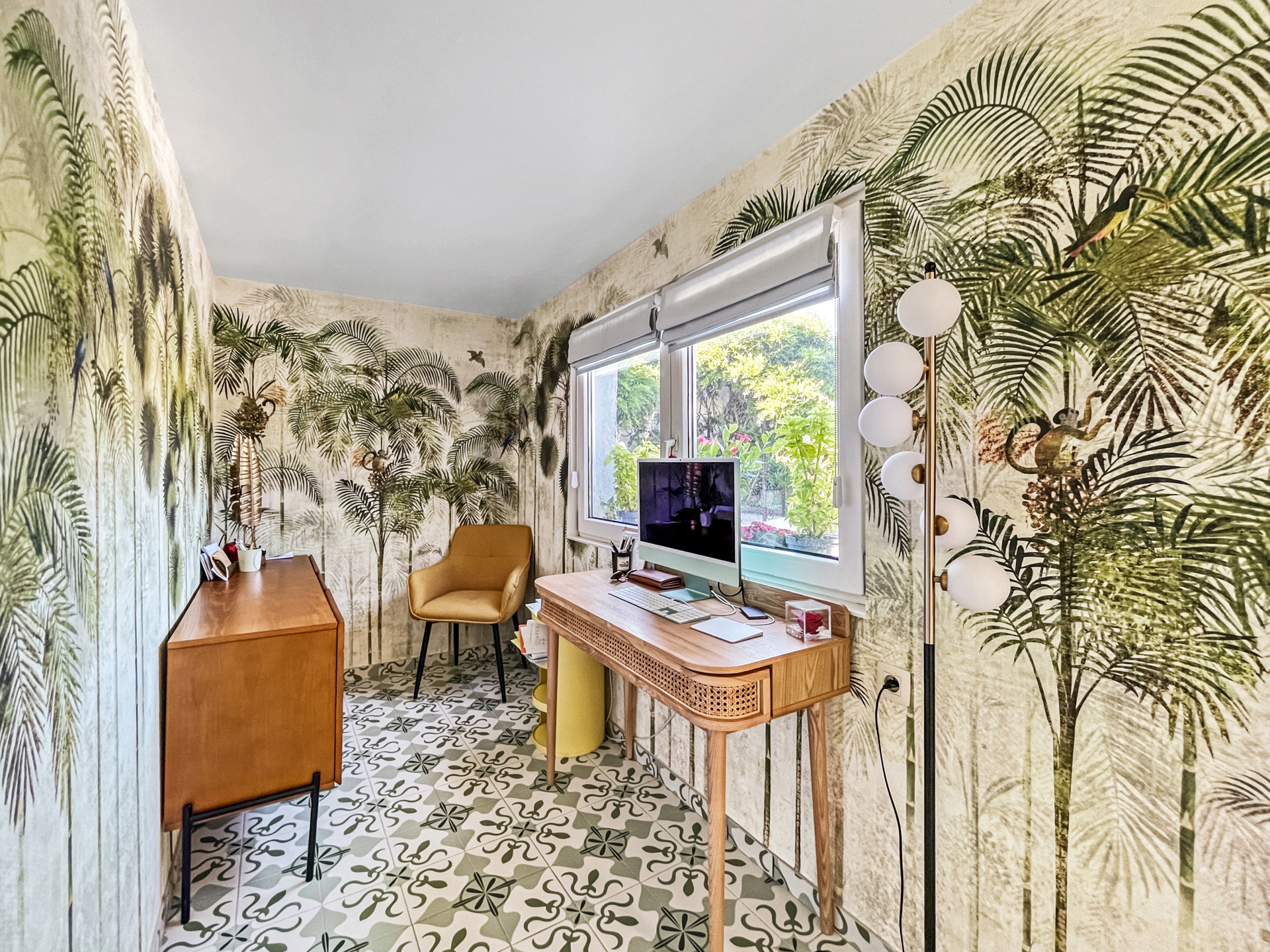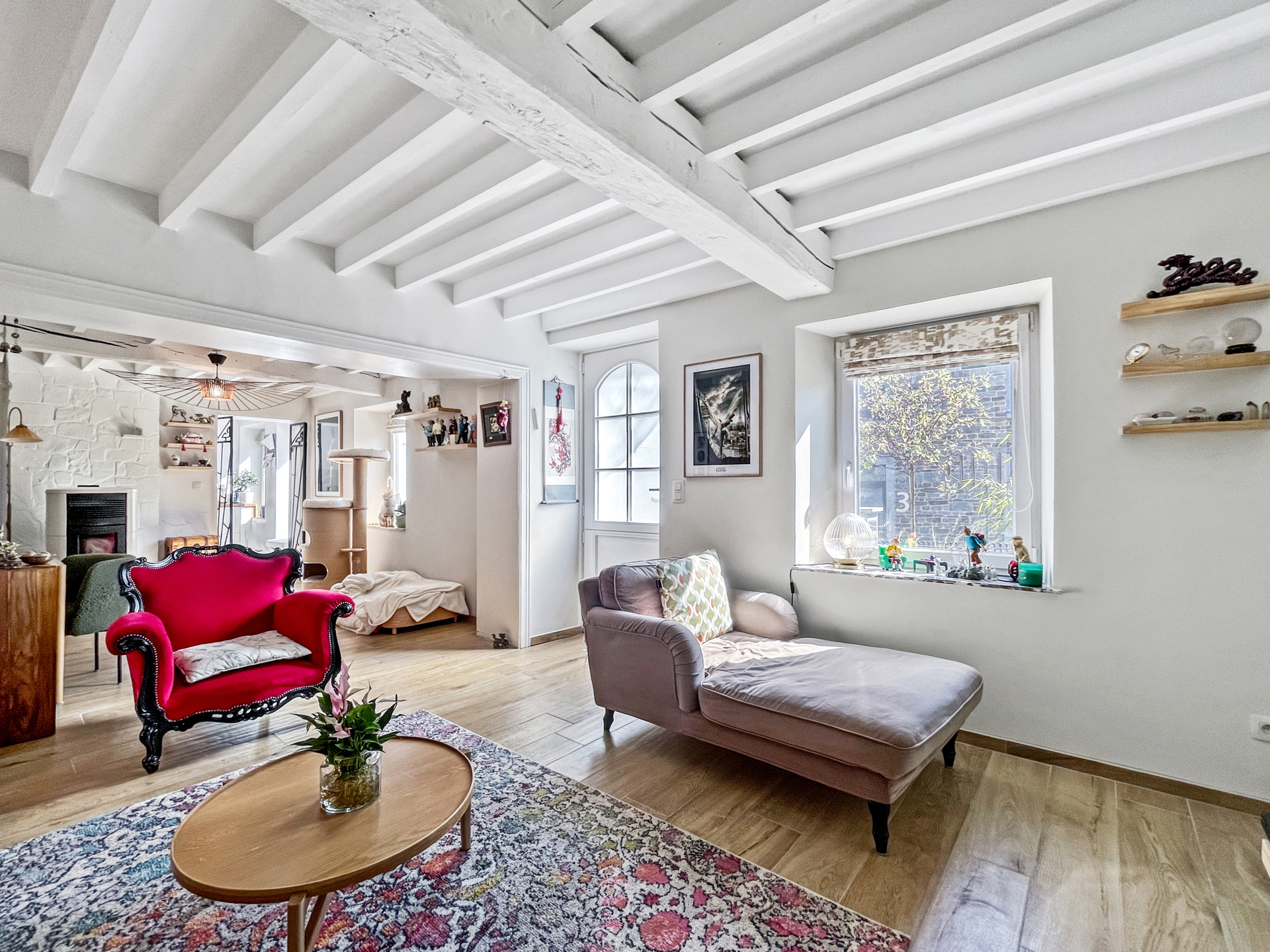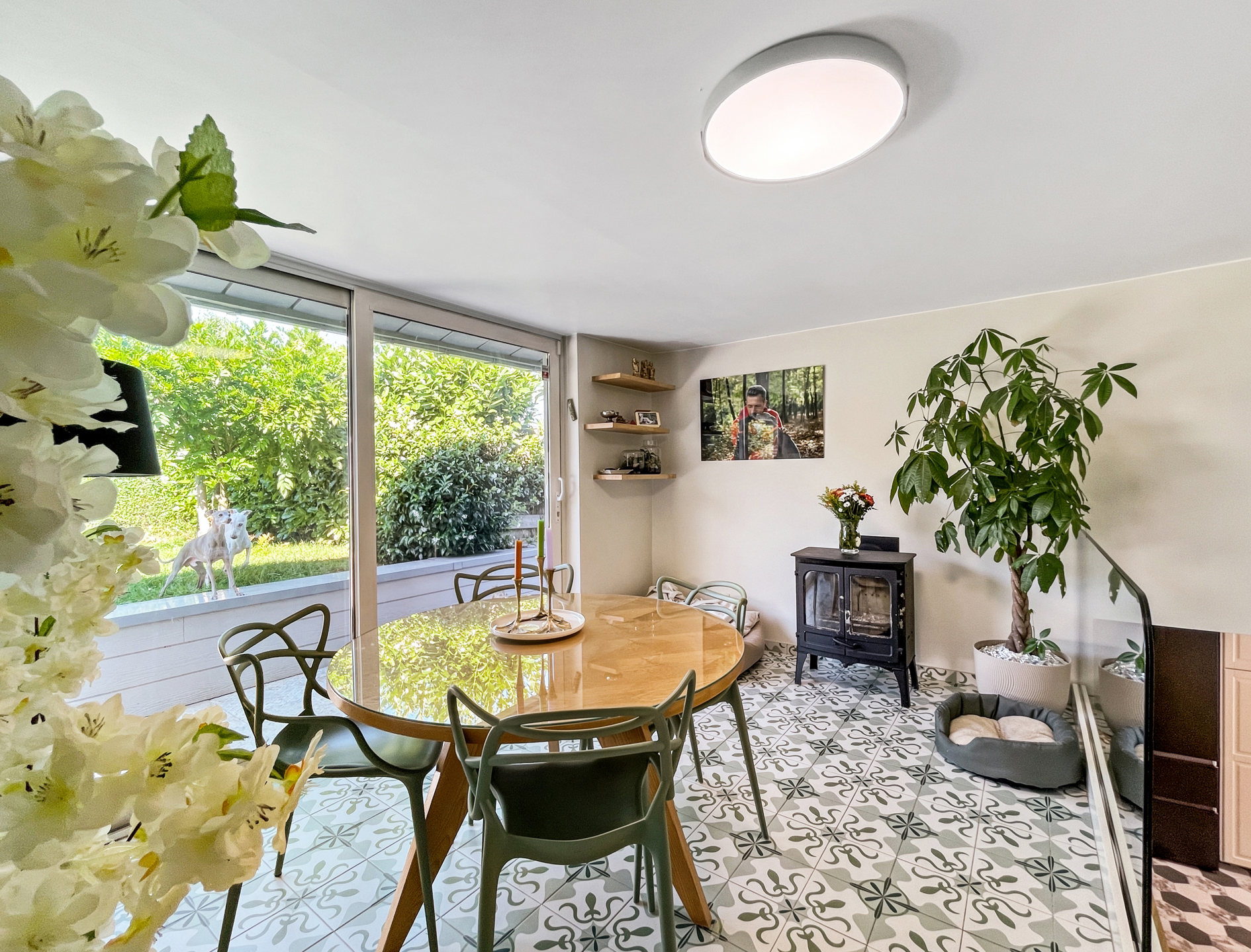 Demi-niveau supérieur : un bureau et un lumineux jardin d’hiver avec cassette à bois, offrant un accès direct à la terrasse et au jardin.