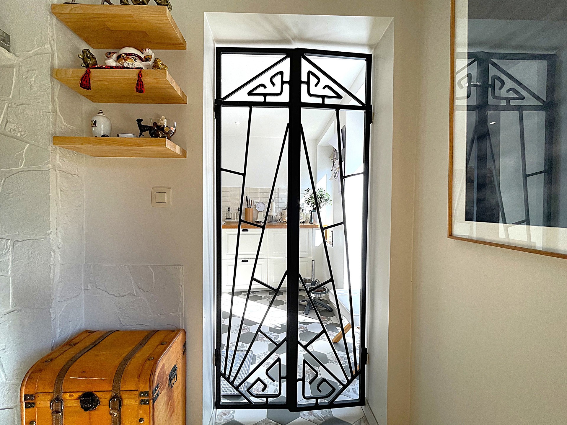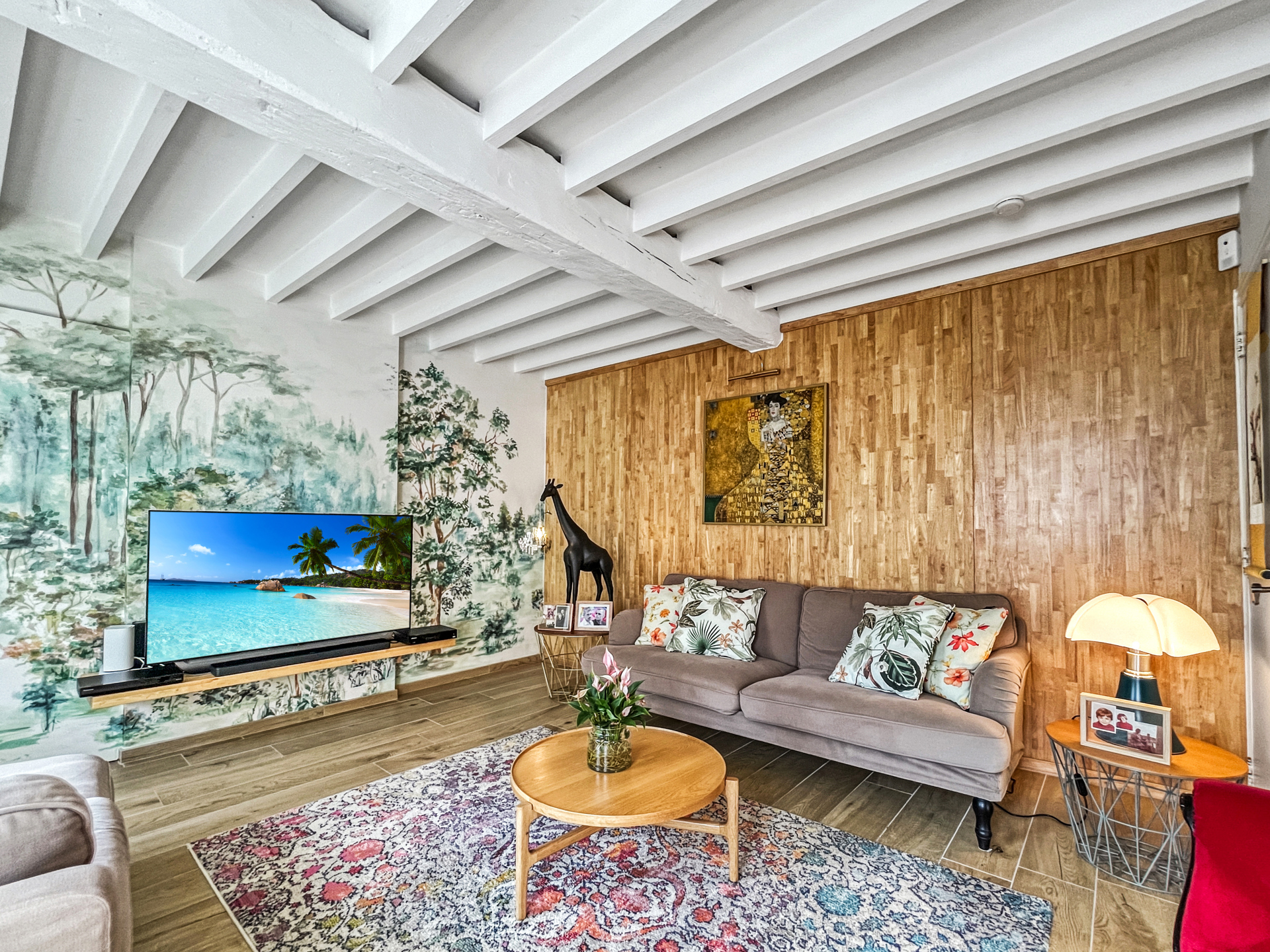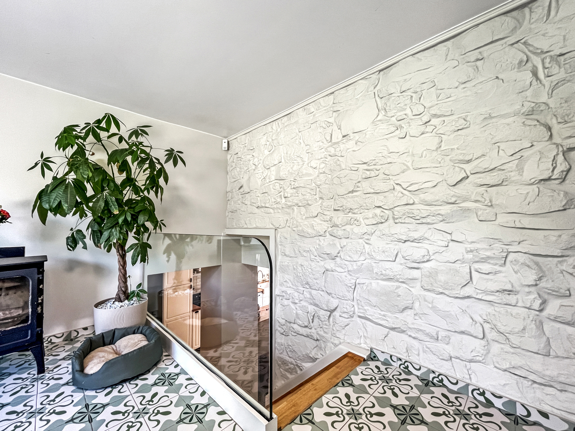 Demi-niveau supérieur : un bureau et un lumineux jardin d’hiver avec cassette à bois, offrant un accès direct à la terrasse et au jardin.