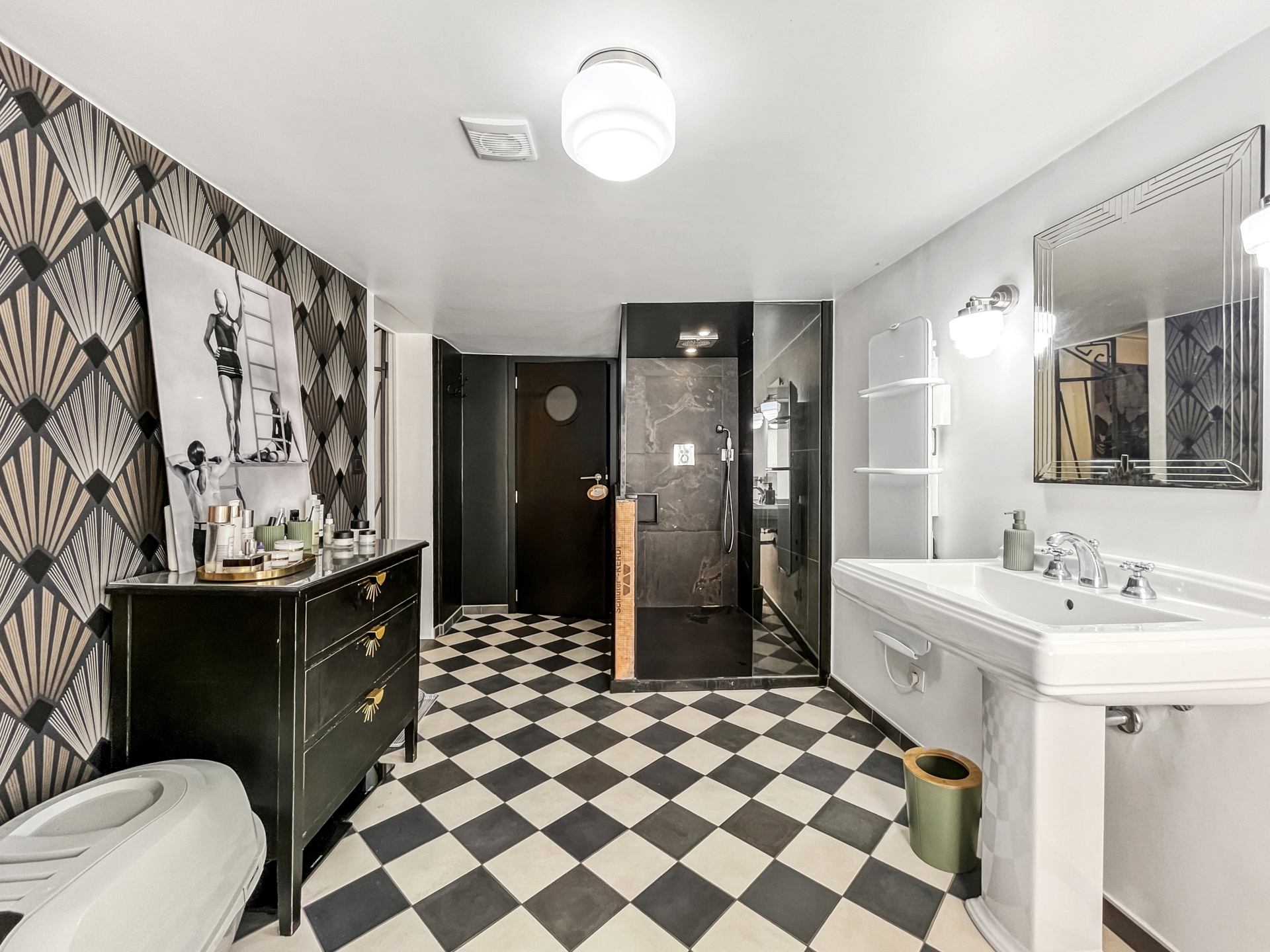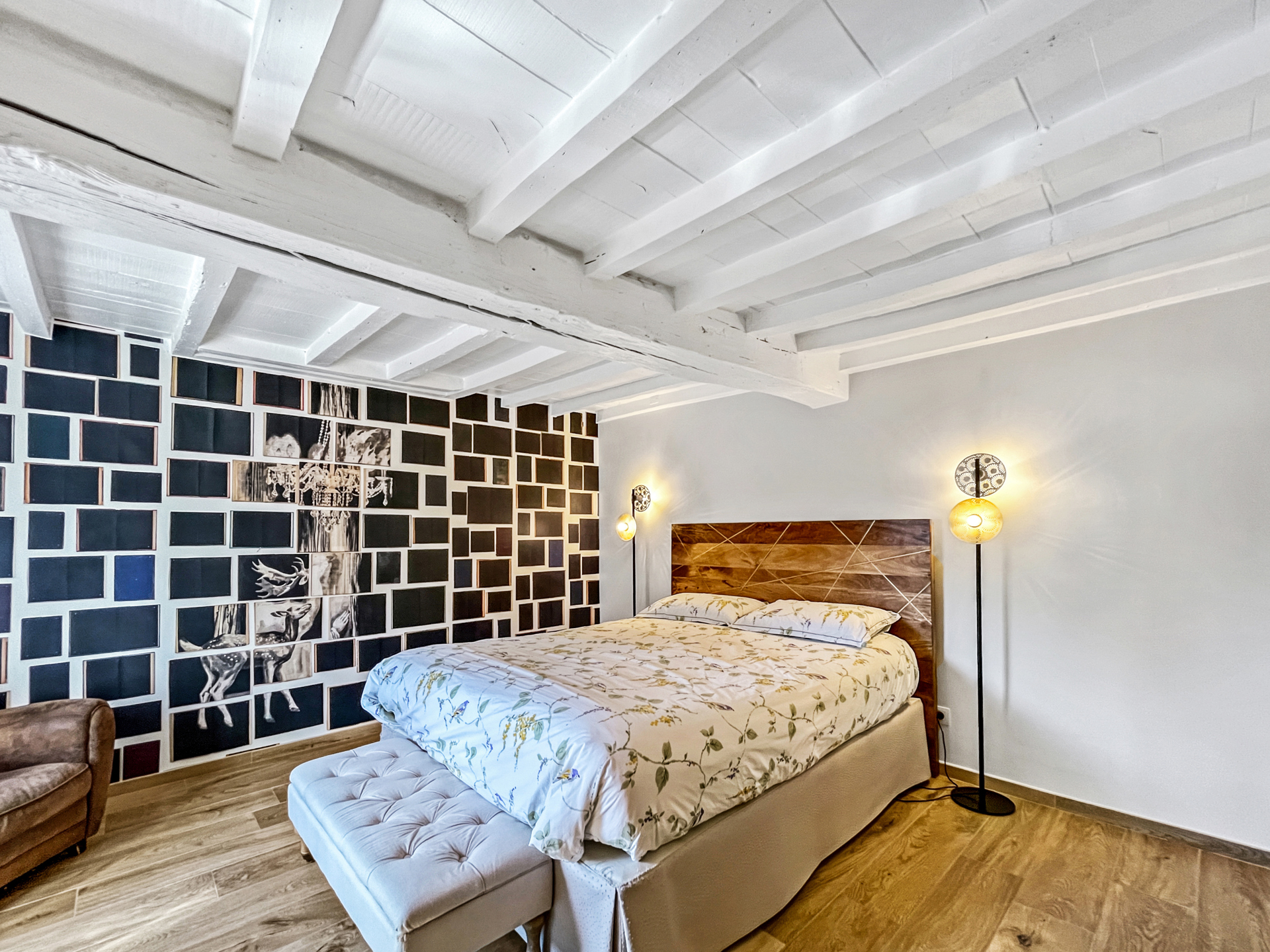 Premier étage : actuellement aménagé en suite parentale, comprenant une grande chambre, un dressing (pouvant accueillir une chambre supplémentaire si nécessaire), une superbe salle de douche et un espace WC/buanderie.