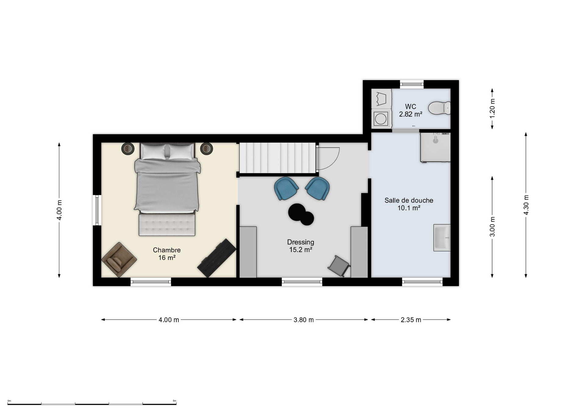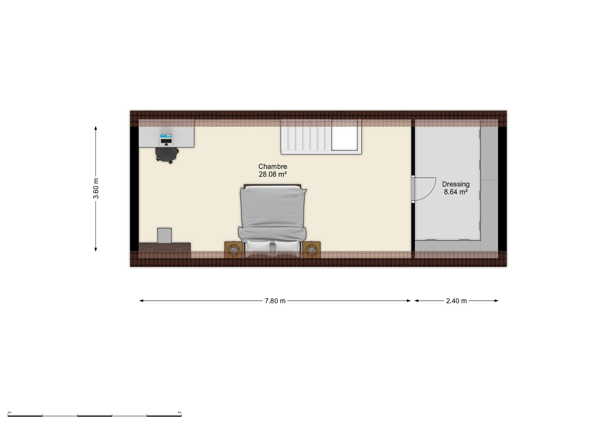 Deuxième étage : une seconde chambre spacieuse ainsi qu’un grand dressing.