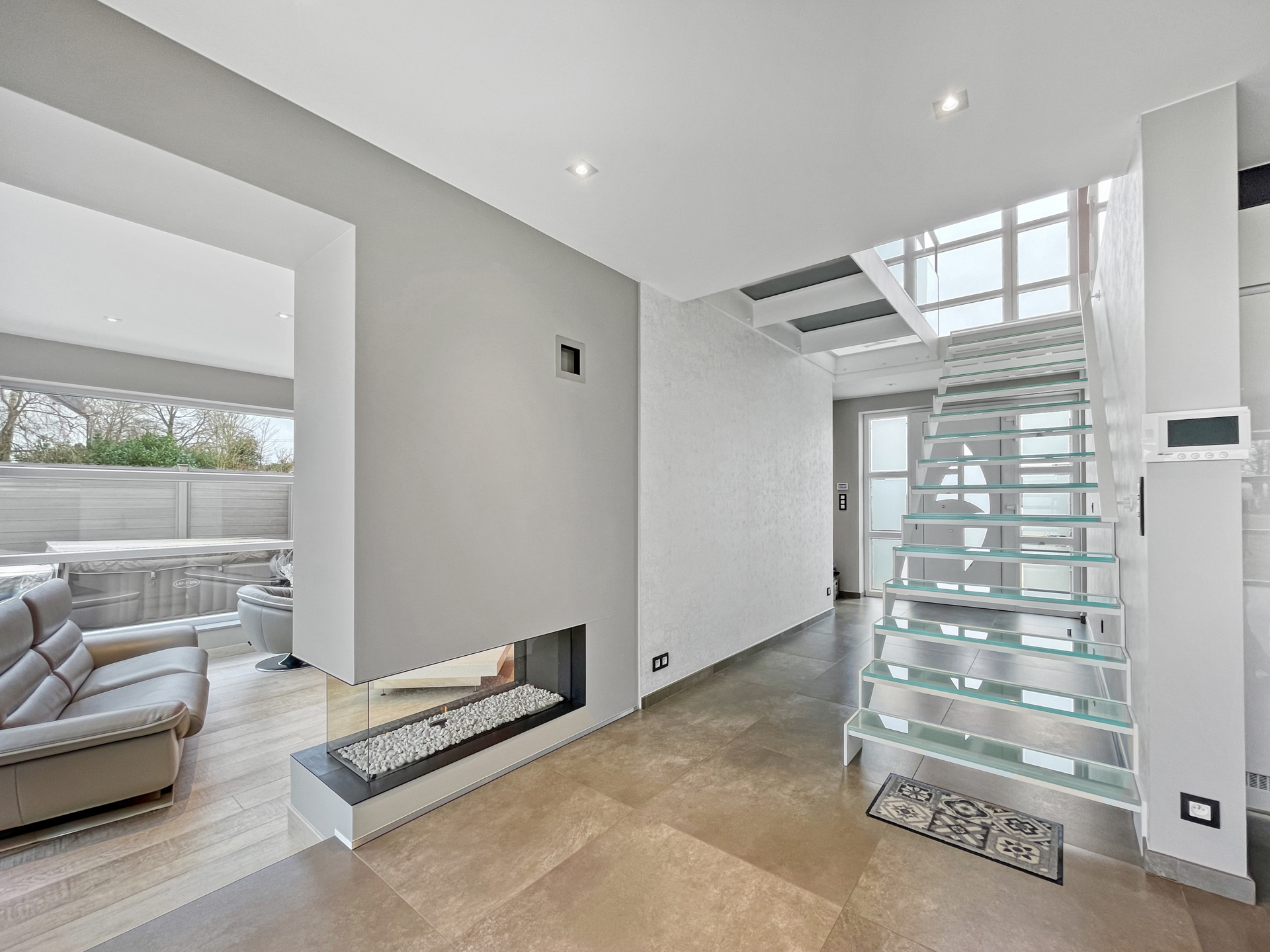 Au niveau de sa composition, vous disposez d'un spacieux hall d'entrée avec son escalier en structure métallique et marche en verre, un Wc, un vestiaire, un séjour ouvert et équipé d'une cassette au gaz, une cuisine très haut de gamme (four vapeur, cave à vins etc...), une très grande buanderie et un débarras, 3 grandes chambres équipées chacune de prise TV, une salle de bain complète avec douche italienne, radiateur sèche serviette et baignoire balnéo, un palier pouvant accueillir un espace bureau et un vaste grenier de rangement accessible via un escalier escamotable.