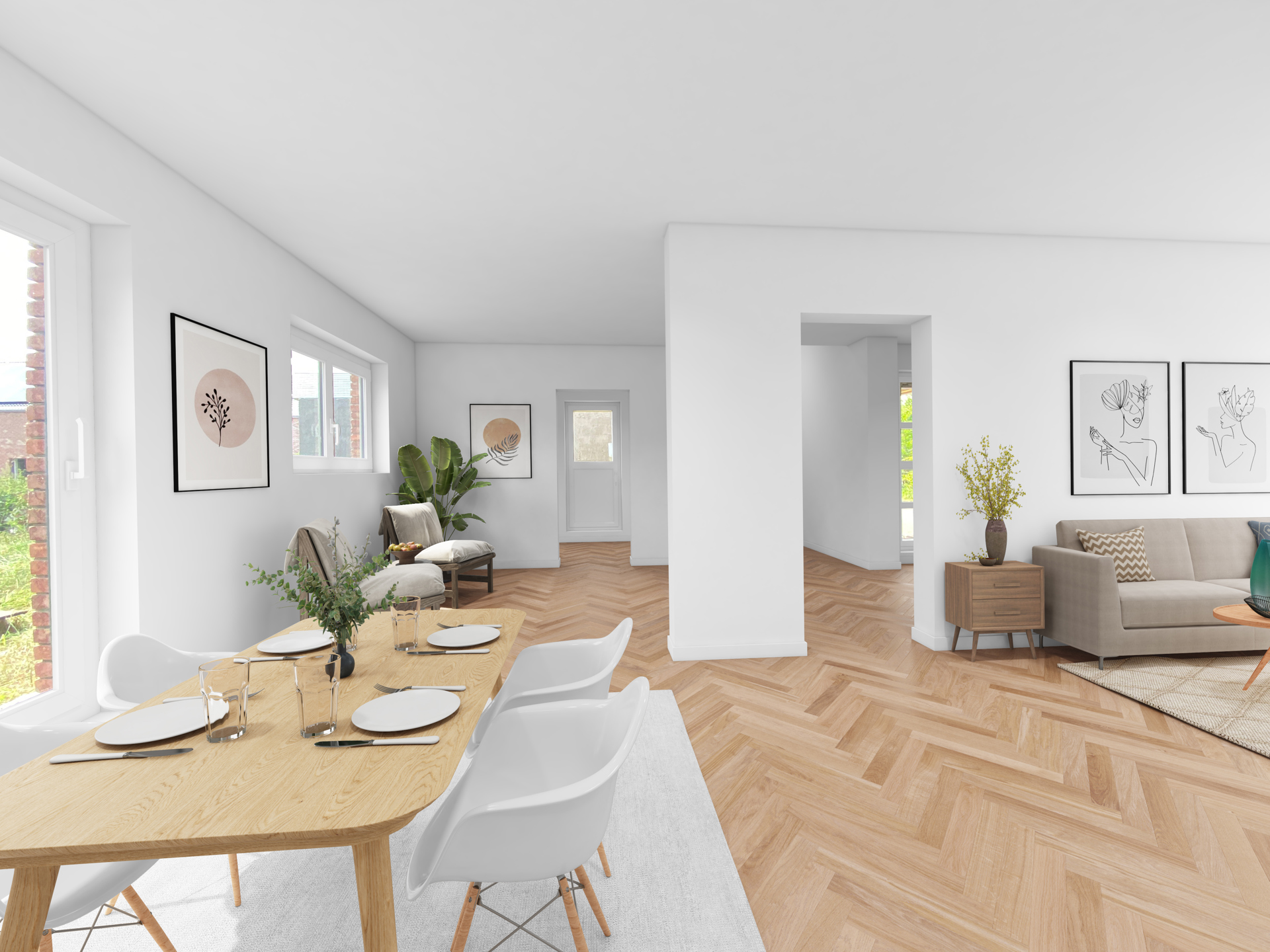 Au rez-de-chaussée : un hall d'entrée, un WC séparé, une magnifique pièce de vie avec cuisine ouverte et une buanderie.